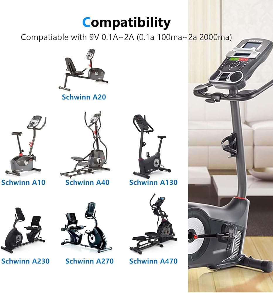 Usage Scenarios This replacement 9V AC adapter with a 6.6ft power cord is perfect for powering your Schwinn bike, exercise equipment, elliptical, recumbent or upright trainer. It is also compatible with a wide range of Casio keyboard models. Whether at home, in the gym, or on the go, this power adapter provides a reliable. With its strict quality control and 30-day money-back guarantee, you can trust in the performance and reliability of this AC adapter.