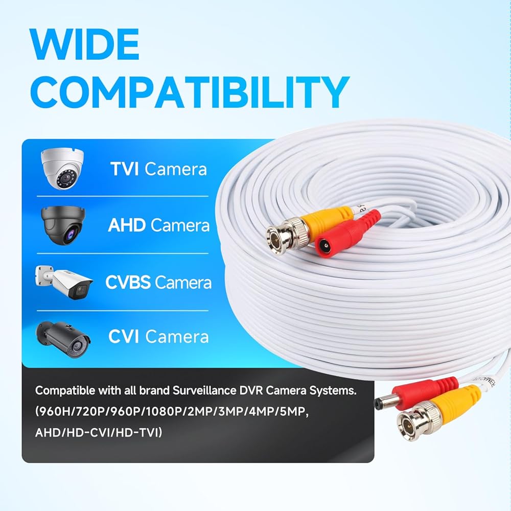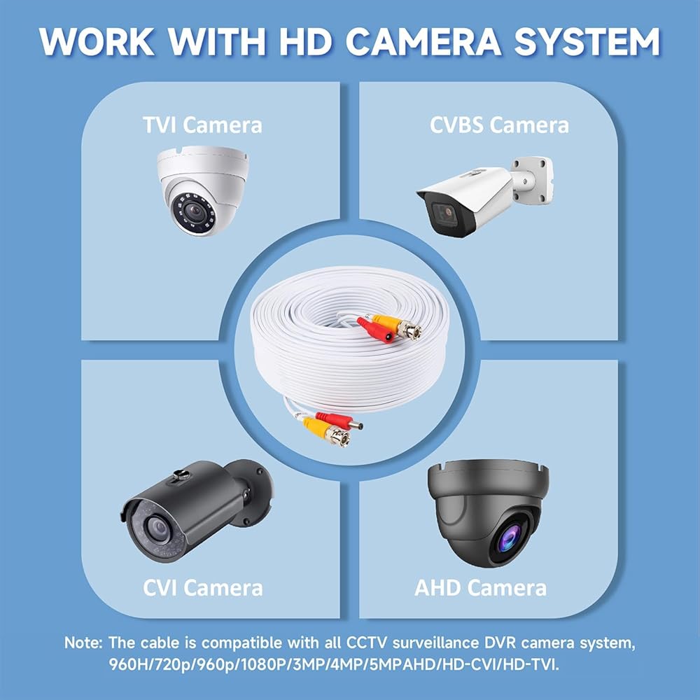 【Smooth 5MP Video Transmission】This cable works for 5MP/4MP/3MP/2MP/1080P/960P/720P/960H, AHD/CVI/TVI/CVBS Security Camera Systems.