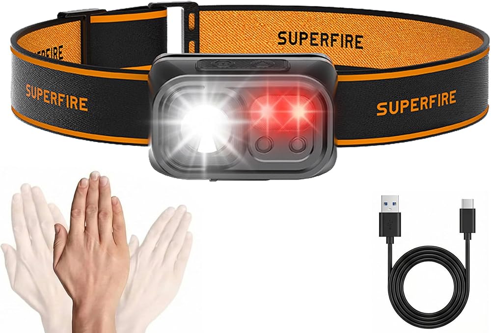 SuperFire Headlamps for Adults Rechargeable, Motion Sensor LED Headlamp, Lightweight Running Headlamp with Red Light, Waterproof Headlamp for Hiking & Camping(HL23-S)