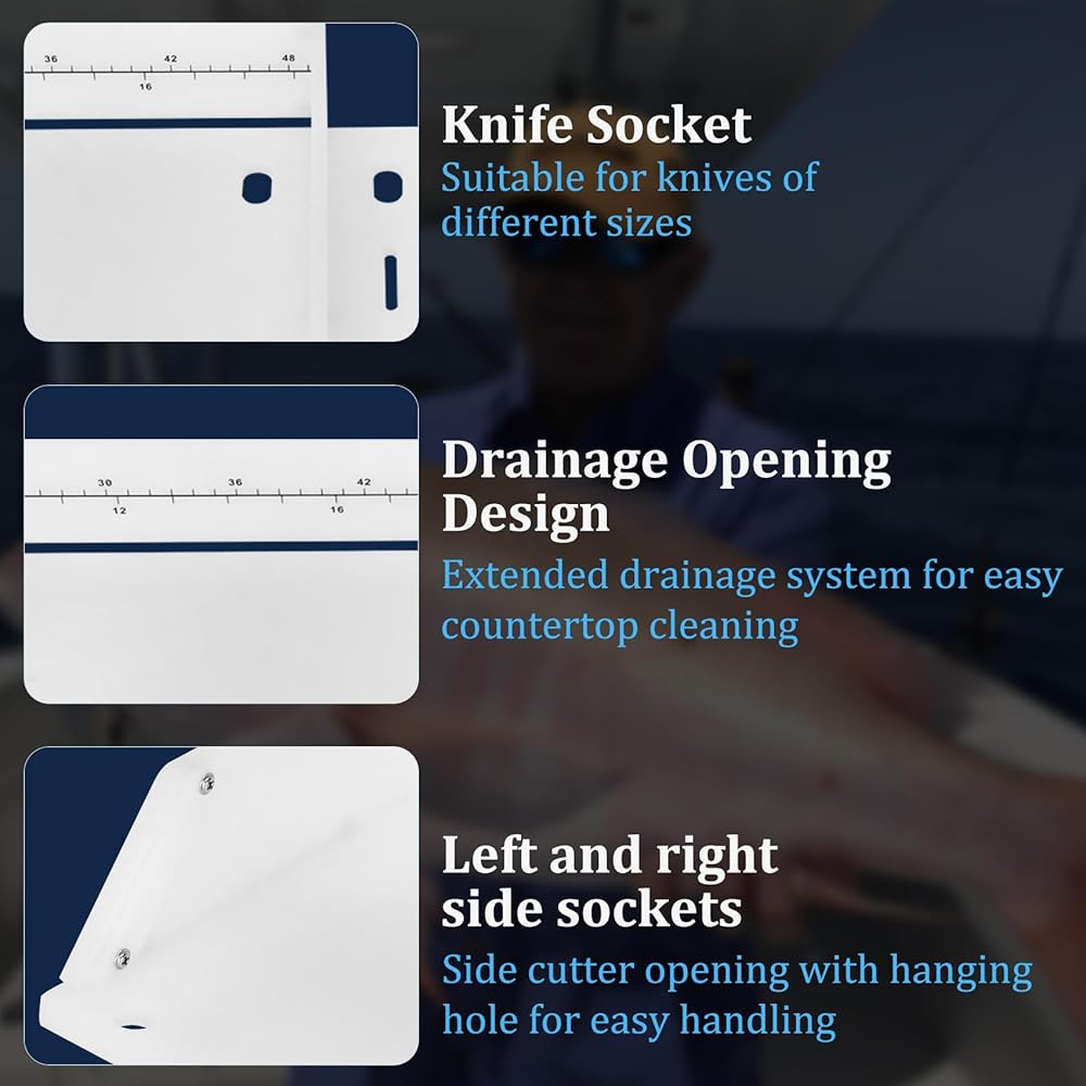 【Unique Design】Comfortable size: 25.1 x 13 inches!Meeting the handling habits and comfort of different users, boat cutting board with rod holder is equipped with multiple knife holders and pliers sockets on both the left and right sides. The side hanging holes are designed to allow for hooks to be installed, effectively preventing tools from falling overboard. The back of boat cutting board is designed with a slot that allows outboard drainage to keep your work surface and boat clean.