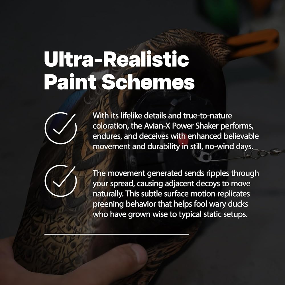 HUNTING DUCK DECOY - The Avian-X Power Shaker Mallard Drake Preener Floating Decoy is designed to create the correct motion of dabbling ducks surface preening; The results are so lifelike that you are guaranteed to fool those wise old late-season birds