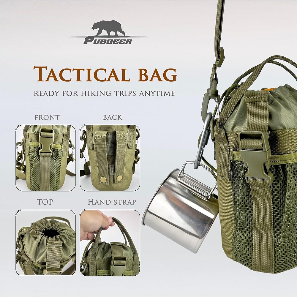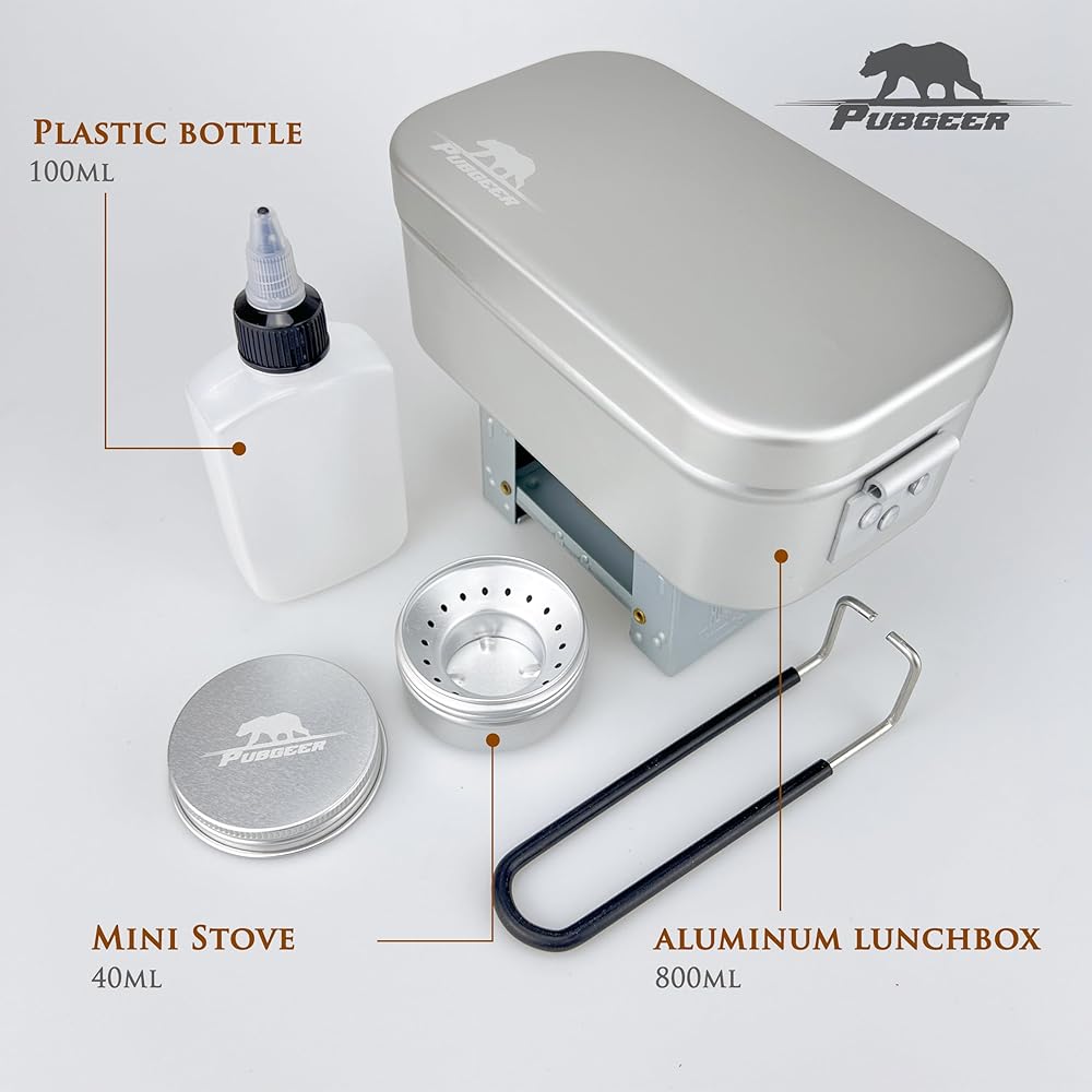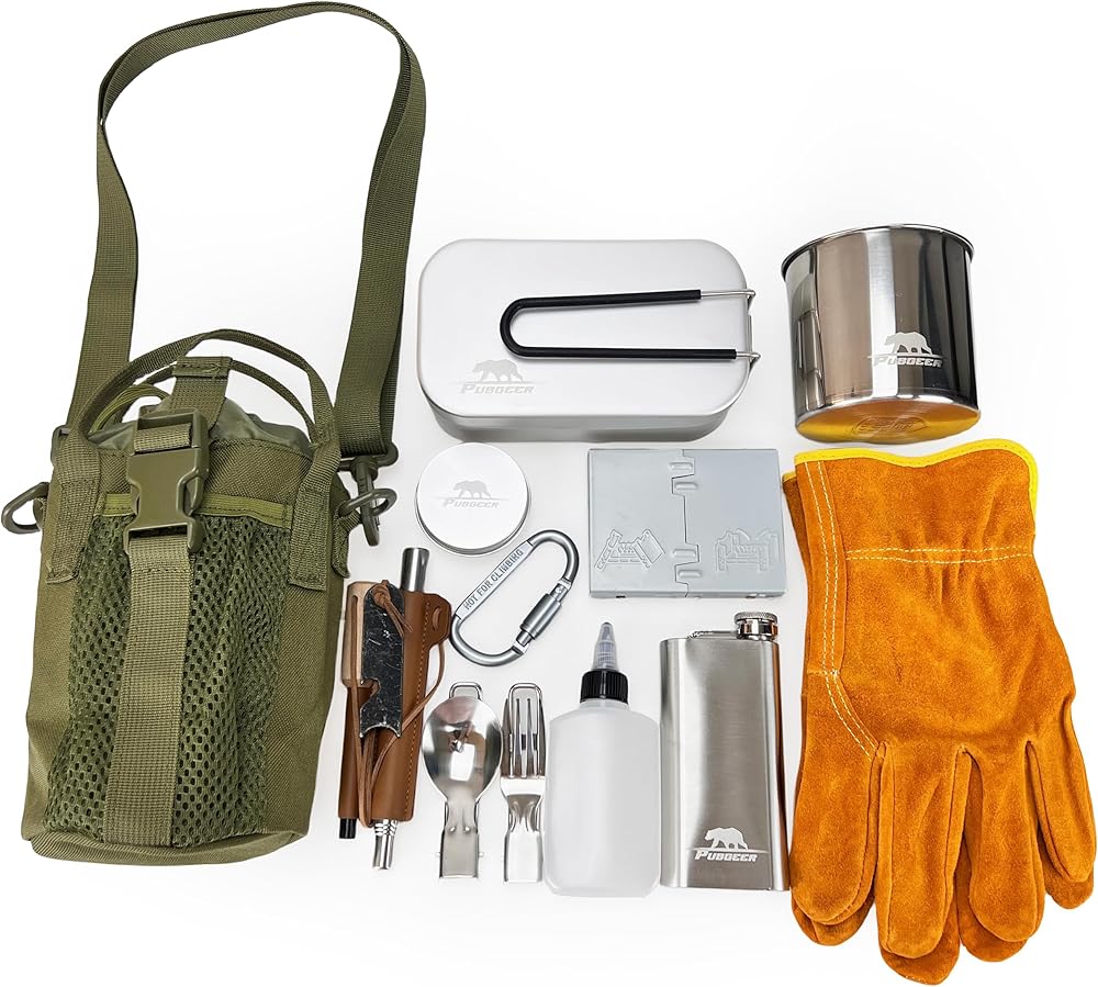 Kit Contents: Includes an Oxford cloth crossbody bag, 800ml aluminum lunchbox, 16oz folding stainless steel mug, portable stainless steel fork and spoon, fire starter and air blower, collapsible stove stand and mini stove, plastic bottle, flask, leather heat-resistant gloves, and a carabiner.