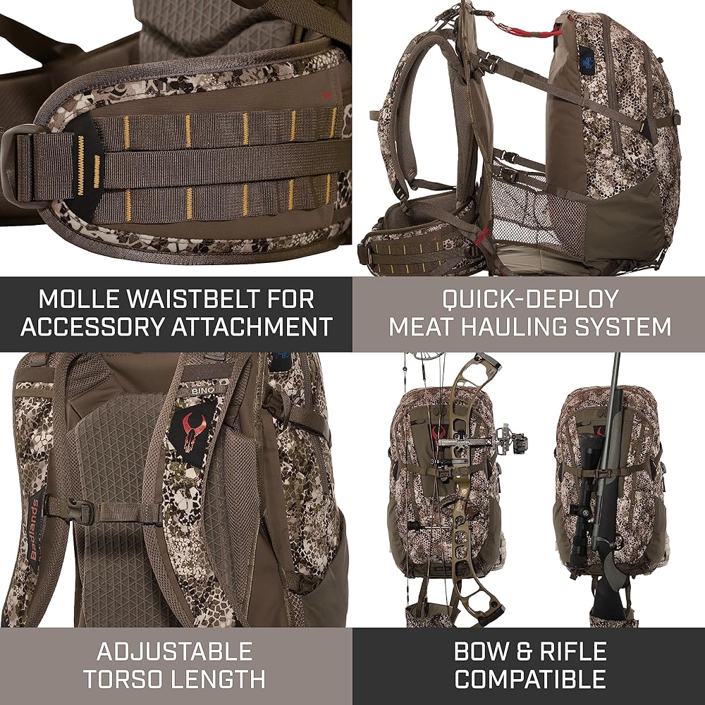Carries Rifle or Bow - Why risk damaging your rifle or bow? Use the built-in Rifle/Bow Boot and the batwing straps on the back of your Badlands pack to securely carry your rifle or bow, hands-free.