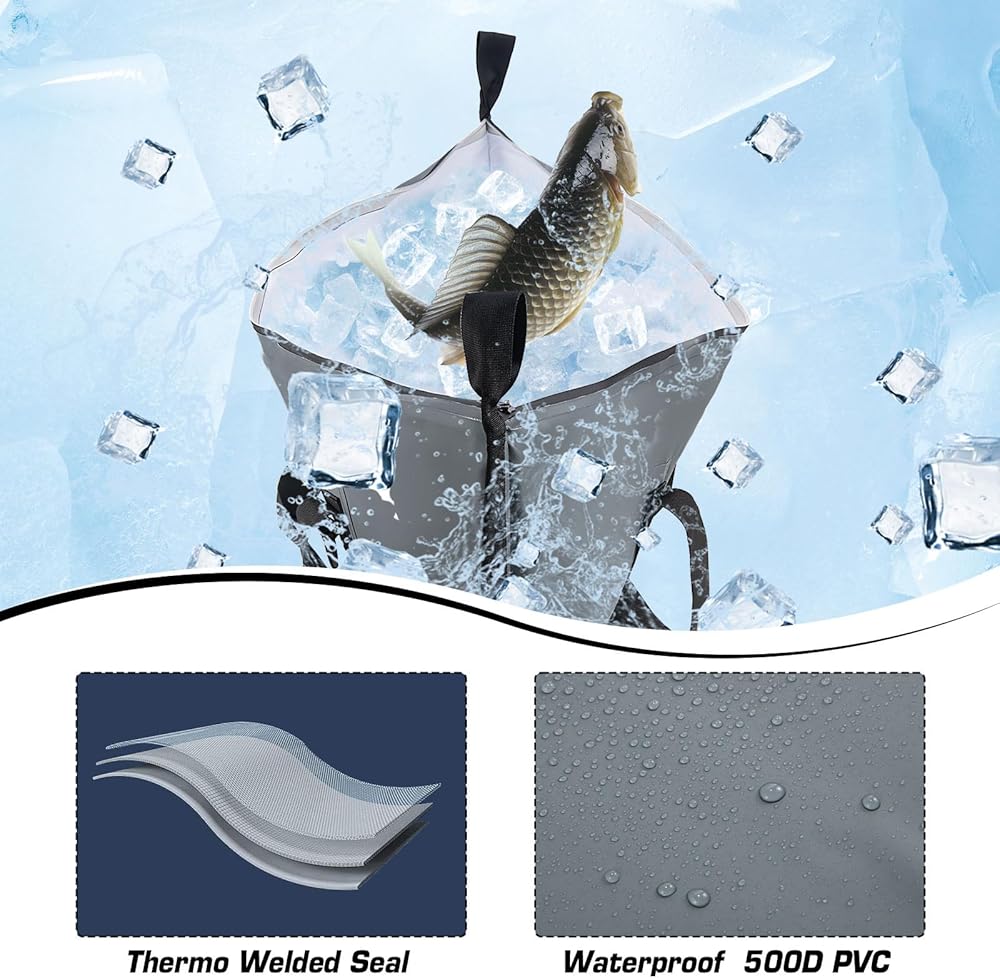 【Keep Fish Fresh All Day】Our insulated fish cooler bags are designed to keep your catch cool and fresh for up to 24 hours. Crafted from heavy-duty 500D PVC material with cotton-foamed insulation, these fish cooler bags are built to last. Its excellent leak-proof and waterproof performance will hold ice longer and keep catch fresh all day long.
