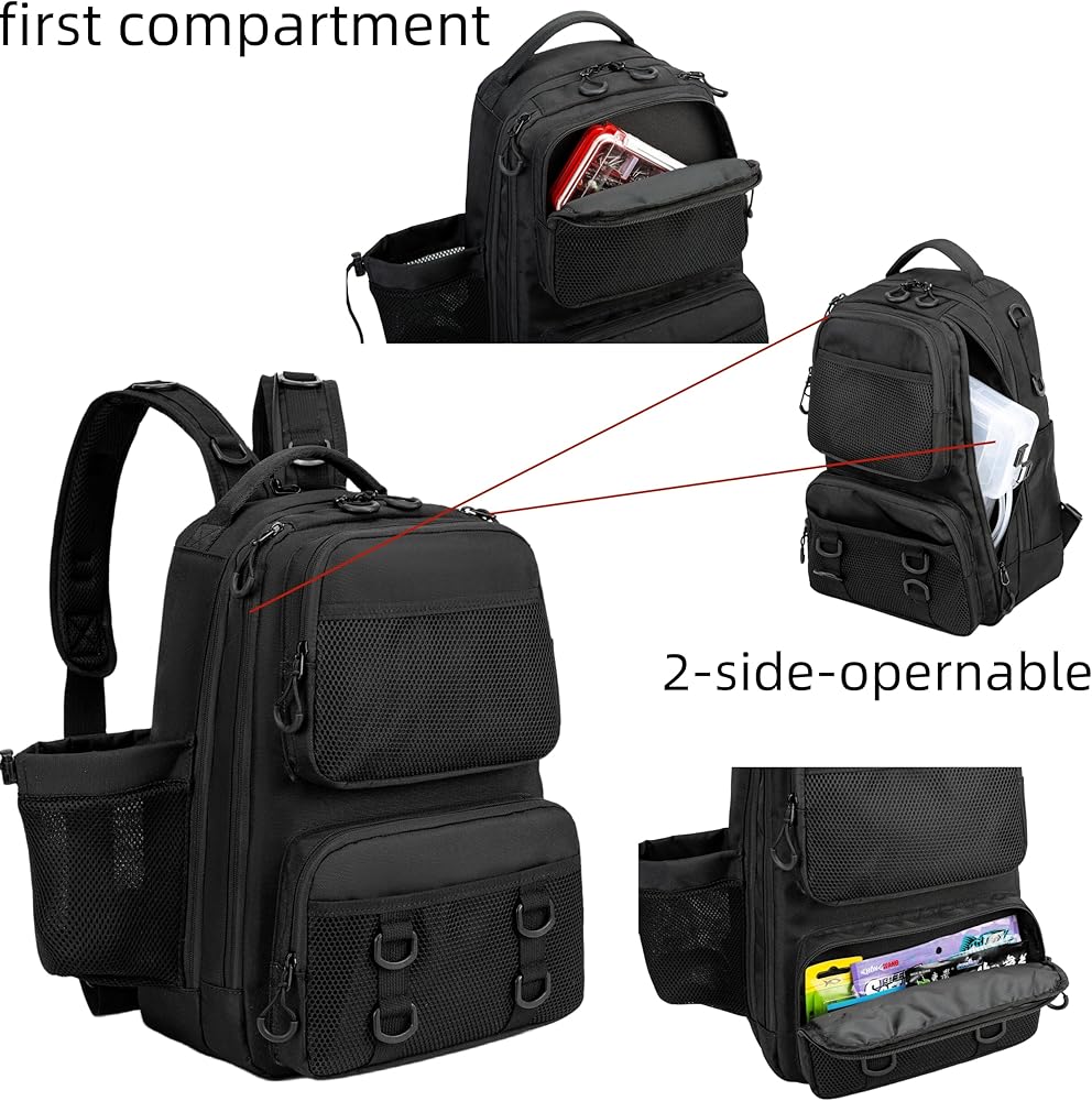 Utility structure: 2 front pockets with mesh pockets compartment for keys, line, lures, terminal tackle and other small items. A 2-side-operable compartment to store larger stuff for more free to use your hand. The last main compartment used to store up to 2- 3600 size tackle trays and includes an internal pocket, perfect for stashing lunch, rain gear, lures and more. (900D nylon)