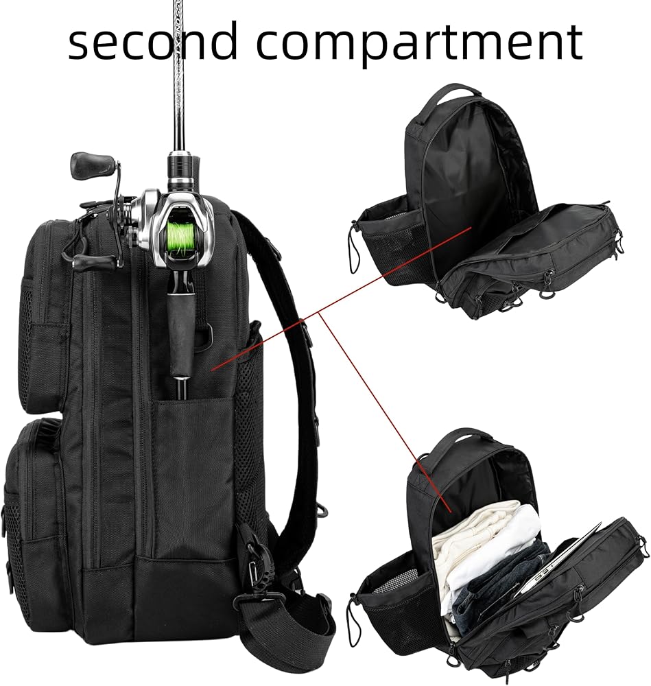 Multi function: Rabjen Tactical Fishing backpacks are a light-weight, versatile, sling bag designed for hiking fishing or other outdoor activities for storing fishing rod/ fishing reel, tools, lures, and tackle for a few hours of fishing. (Dimensions – 16''x 11.8'' x 6.7'')
