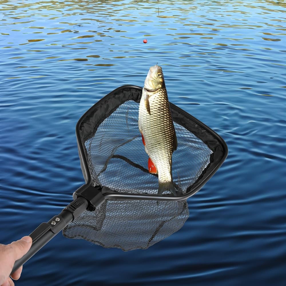 ● The net features a well-crafted 15.8" x 11.8" hoop and an 11.8" deep mesh, blending aesthetics with practicality for all your fishing adventures. To ensure stability, simply fasten the rotation switch for a firm, non-slip lockdown.
