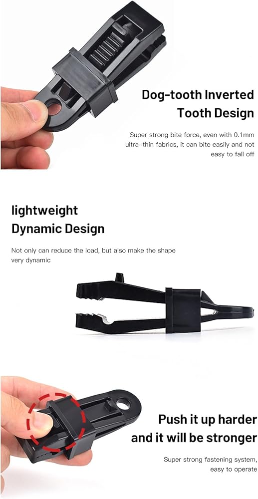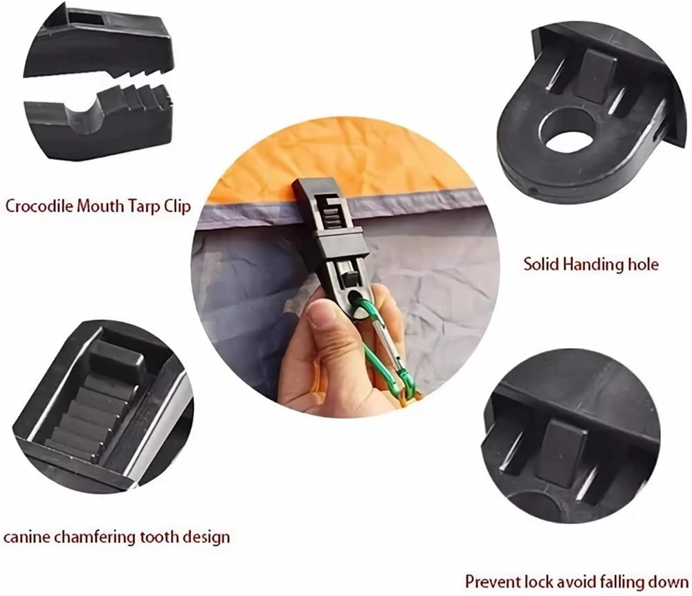 The fixing clip is widely used in outdoor camping, backpacking, hiking, fishing and other occasions, can be used to fix tents, tarps, canopies, canvas, tarpaulins, banners, boat covers, swimming pool covers, fabric covers, etc.