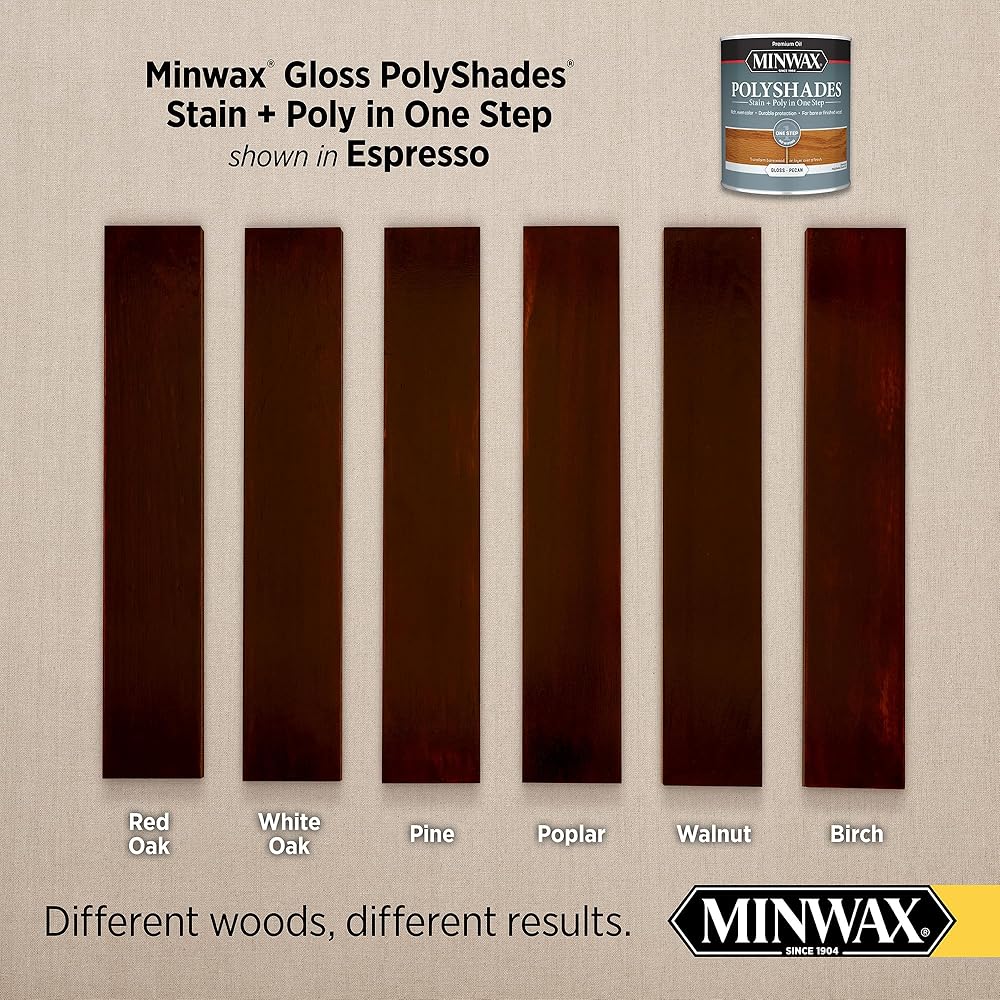 POLYSHADES WOOD STAIN – Minwax PolyShades is an oil-based wood stain and poly in one. It enhances wood grain by combining beautiful, rich color and long-lasting polyurethane protection in one easy step.