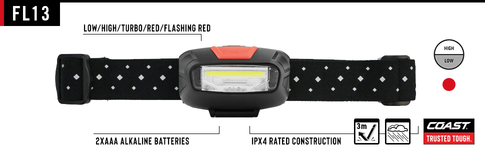 The FL13 is a compact C.O.B. LED headlamp. The C.O.B features a High and Low light outputs. This headlamp casts a wide beam and is handy for up-close work. Also, the FL13 includes a solid and flashing red LED light feature. The red LED light beam help to prevent night blindness. With Coast's commitment to quality, the FL13 Headlamp is impact resistant, weather resistant and its LEDs are virtually unbreakable. Tested and rated to ANSI/FL1 standards.