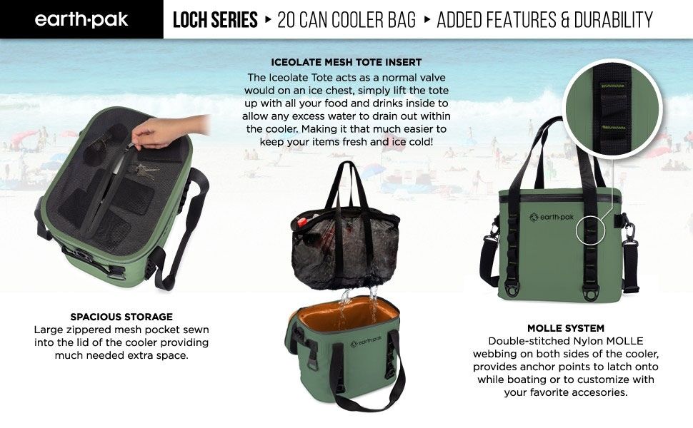 ADVANCED FEATURES: Large zippered mesh pocket on top lid, for easy access to personal items or other outdoor essentials. Bottle opener is included and attached to the side of the cooler to get the party started. Double-stitched Nylon MOLLE webbing on both sides of the soft sided cooler, provides anchor points to latch onto while boating or to customize with your favorite accessories. In addition, 4 attached D-rings at the base allow for quick fastening to your boat or kayak.