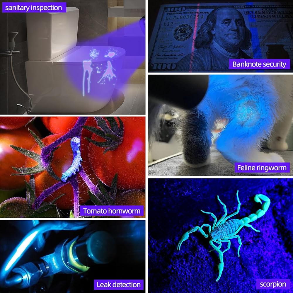 • ❺【READY FOR YOUR NEED】-- It's a needed multifunctional black light in your life -- Detecting dried urine, stains; Curing UV resin and green oil; Glow uv paints, reactive minerals and uranium glass; Banknote / gem appraisal; Locate hidden cracks, glue, AC leak etc. 【WARRANTY!】We will be responsible for your dissatisfaction (180 DAY no reason refund), If you have any problems with the uv Flashlights, please feel free to contact us via email on AMZ (from your Amazon order) ✔
