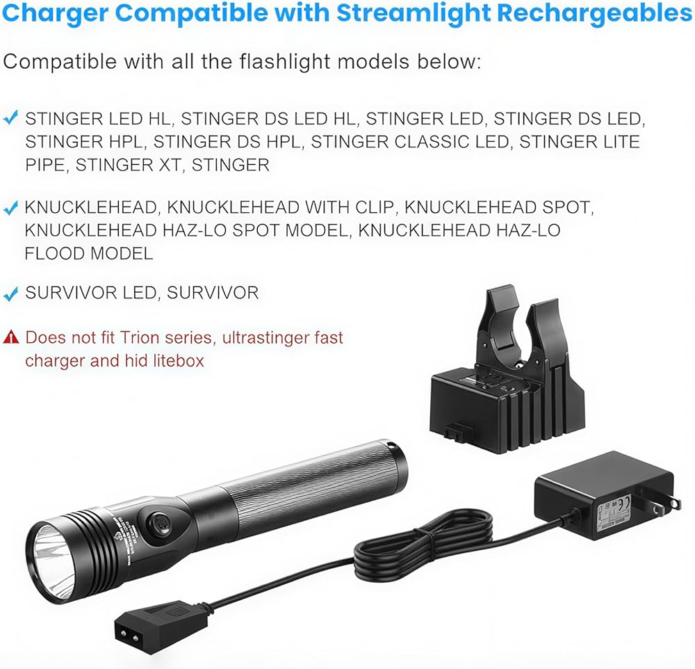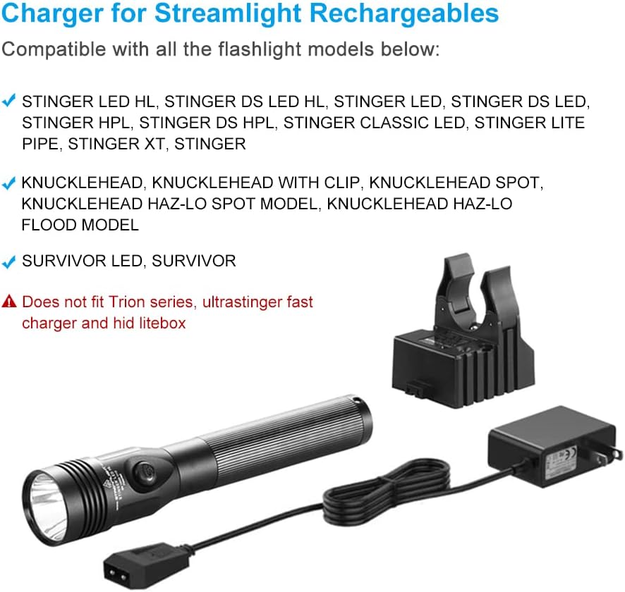 • Widely Compatible: Streamlight flashlights charger bases and holders fits Stinger series flashlights, Litebox Lantern, works with Stinger, Stinger LED, Stinger HPL, Strion LED HL, UltraStinger, Kunchklehead, Polystinger, Survivor, Vulcan and E-Flood rechargeable battery. (Note: In addition to the above strion models, the rest strion are not suitable, Please purchase after checking)