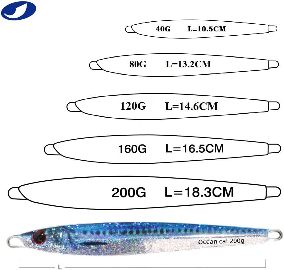 DESIGN: OCEAN CAT lead metal flat slow fall pitch fishing jigs Lures with attractive bright colors ,ideal for reflecting light and attracting fish from a significant distance.Glow in the dark,which can be more attractive to target fish.The front and back of jigs are asymmetric, it will present a multiple actions under water.