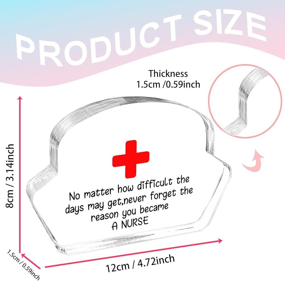 What you will receive: 1 x Acrylic Tabletop Decoration Gift for Nurse Its size is about 12 x 8 x 1.5cm/4.72 x 3.14 x 0.59 inch, suitable size can be placed on the desktop of the office, and it will not take up too much space for you Use school nurse office decorations in various occasions such as home, classroom, office, study room, hospital, put them on the table or shelf, and also use them as paperweights, which will meet your using needs