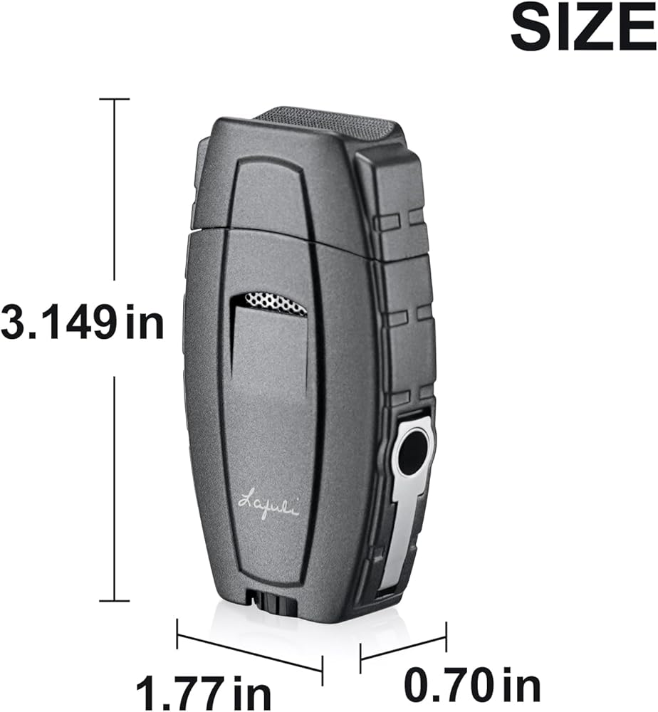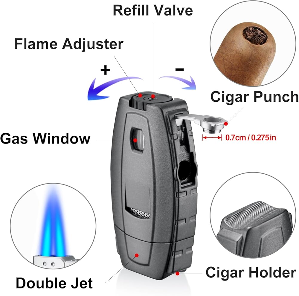 【Dual Jet Flames】It provides a powerful and even flame for quickly and easily lighting your cigar. Secondly, the double flame design allows for a wider area to be lit at once, ensuring an even burn throughout your smoke. Additionally, the sleek and stylish design of the lighter makes it a great accessory to complement your other smoking gear.