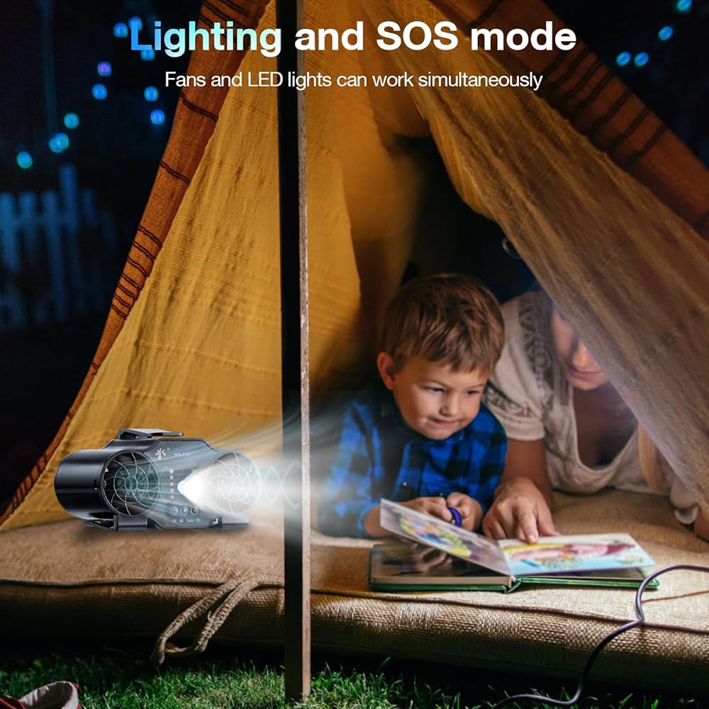【LED light and SOS modes】The portable cooling fan equipped with both fan and lighting functions, it is a must-have for outdoor camping in summer. Both the fan and LED lighting can be turned on at the same time when camping in the wilderness at night. It can also be switched to SOS mode in emergency.