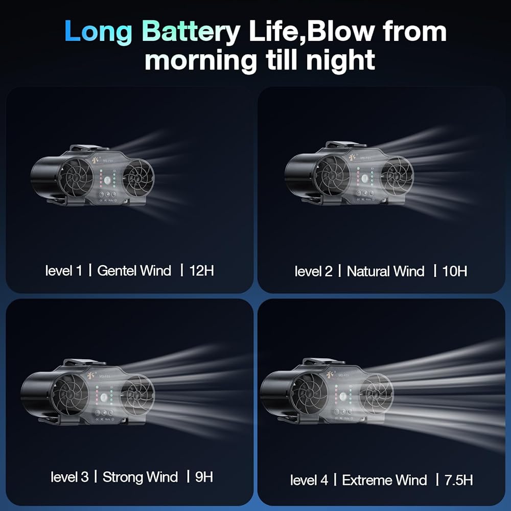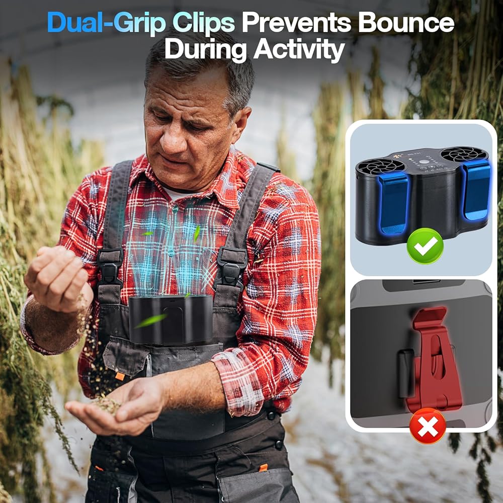 【Dual air outlets body fan】The body fan design with 2 air vents, give you double the coolness in the hot summer.We have added one belt clip, the waist fan hung on the waist by two clips make it more stable and fit the body better.