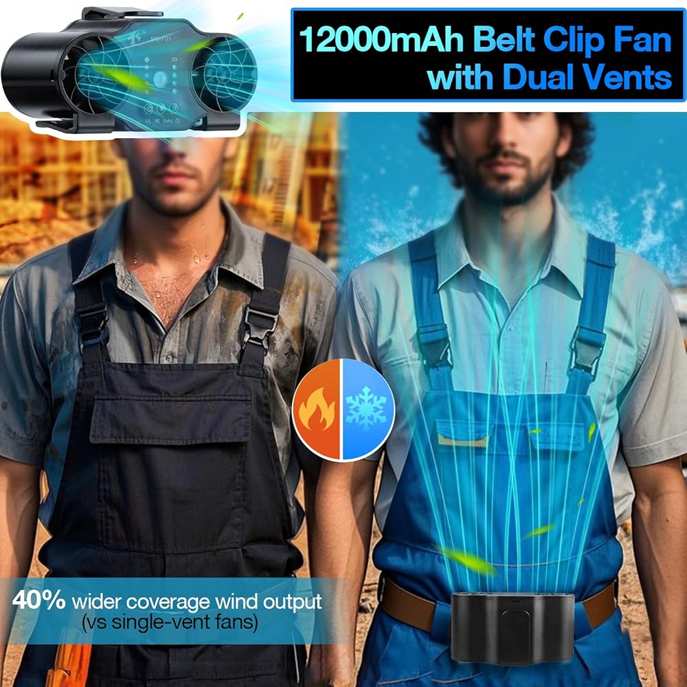 Dual Vents Powerful Portable Waist Clip on Fan for Shirt 12000mAh, Reversiable Airflow Belt Wearable Cooling Device with 4 Speeds LED SOS Light Battery Powered for Outdoor Camping Travel Fishing