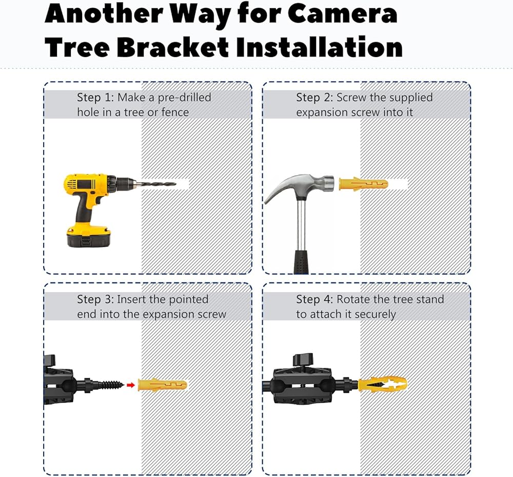 • Adjustable Camera Arm Tree Mount: Place the expansion screws into the pre-drilled holes in the surface of the fence or tree before screwing in the tracking camera bracket and loosening the individual adjustment knobs to rotate the ball joints to adjust the orientation of the unit;