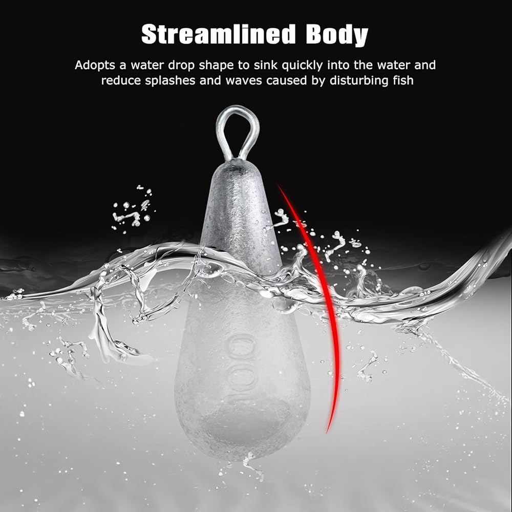【Streamlined Shape for Rapid Sinking 】 Designed with a sleek, streamlined shape, our sinker weights swiftly descend into the water, reaching your desired fishing depth promptly. The secure attachment ring guarantees a sturdy connection to your fishing line, preventing accidental loss and enabling you to fish with confidence.
