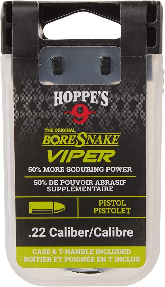 A one pass solution, the bore snake Viper includes a bore guide for easier entry into the firearm bore and has 33% more scrubbing power than the original bore snake by using an additional integrated bronze brush to scrub out carbon fouling, while the tail clears the barrel of loose debris with a surface area 160x larger than a standard patch. The Hoppe's bore snake Viper now comes with a compact carrying case with a built in handle for easy storage between firearm cleanings. Hoppe's bore snake Viper den conveniently fits in a range bag or backpack to protect your bore snake brushes during transport. The lid of the snake den doubles as convenient pull handle that snaps into the clear case for storage.