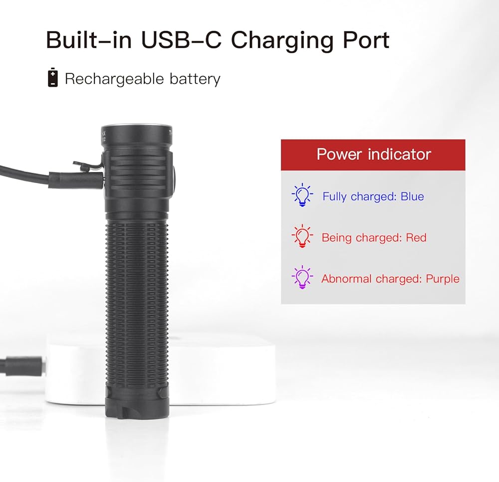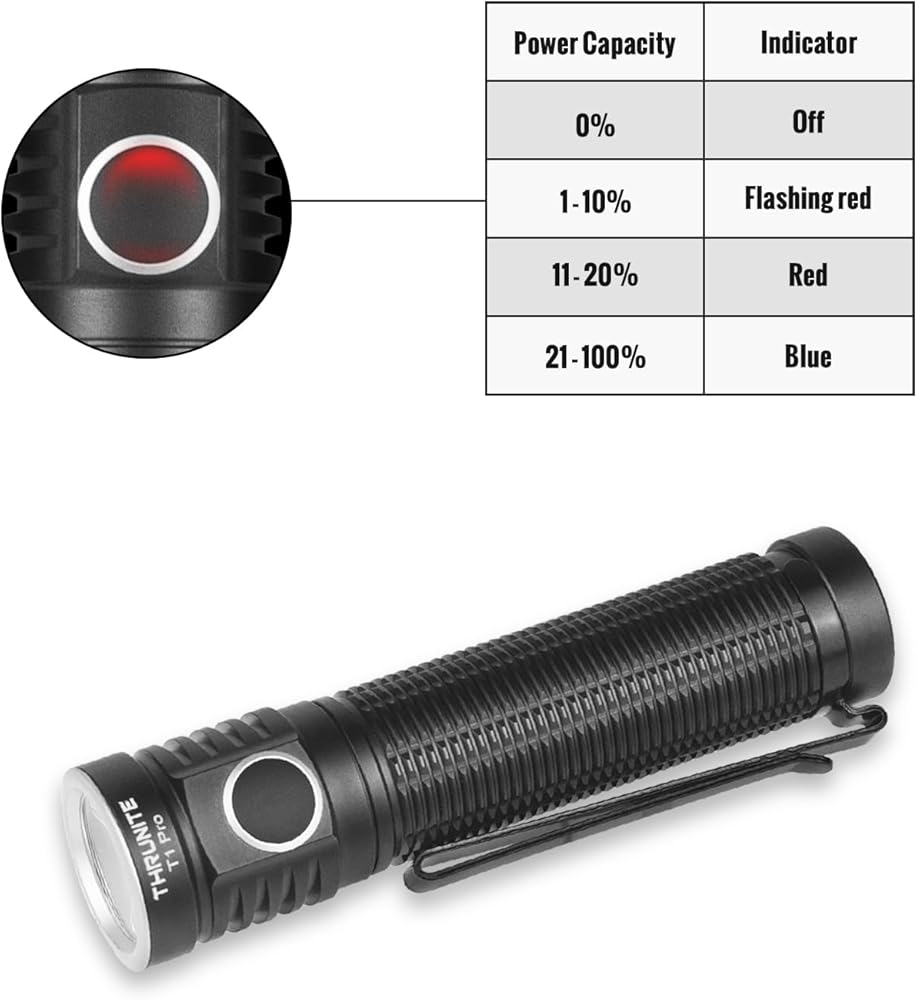 - T1 Pro torch powered by an included battery, built-in USB-C charging port and cable. Battery indicator displays the battery level.