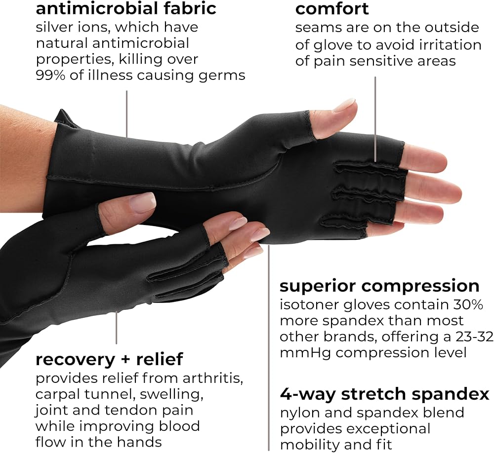 Lightweight and comfortable, these gloves are soft and seamless. Easy to take on and off, they also feature open fingertips so you can easily preform actions. The compression minimizes hand swelling and pain due to injury, arthritis, carpal tunnel, and other chronic conditions. Seams are outside to avoid irritation on areas of pain. As always when treating ailments, contact your physician if symptoms persist or worsen. Latex free.