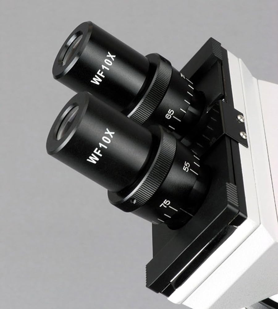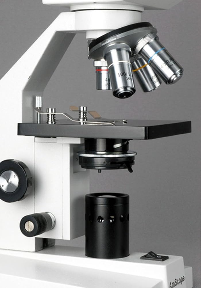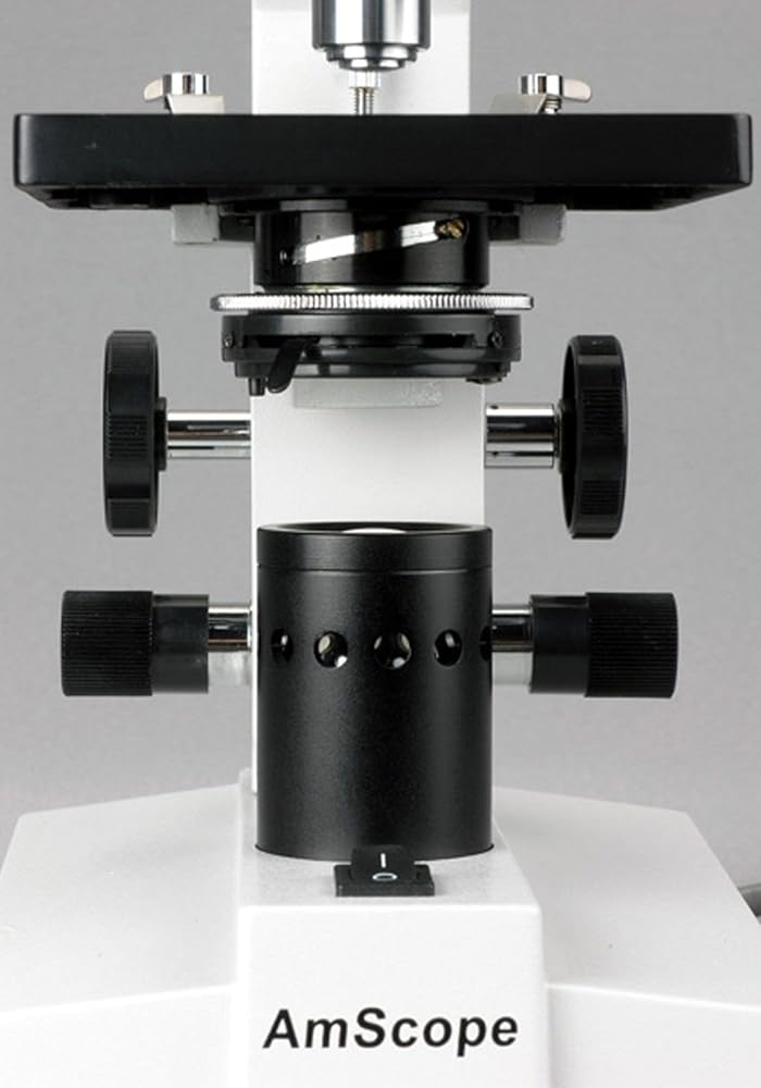 The AmScope B100B compound binocular microscope has pairs of 10x and 20x widefield eyepieces, a forward-facing nosepiece with four DIN achromatic objectives, Brightfield (BF) illumination from a 20W tungsten bulb, a 1.25 NA Abbe condenser, and a fixed stage.The binocular viewing head has interchangeable pairs of 10x and 20x widefield eyepieces on a sliding head to adjust inter-pupillary distance, a fixed 45-degree vertical inclination to reduce eye and neck strain, and a 360-degree rotation capability to provide a more comprehensive view and enable sharing. The sliding head has an adjustable inter-pupillary distance of 55 to 75mm. The forward-facing nosepiece has 4x, 10x, 40xR, and 100x (oil) DIN achromatic objectives that combine with the eyepieces to provide color correction of magnified images at eight magnifications. The 40xR objective is spring loaded to prevent slide damage when focusing. The 100x oil objective provides increased resolution over a standard objective. A compound microscope is used for inspection and dissection of specimens when two-dimensional images are desired.
