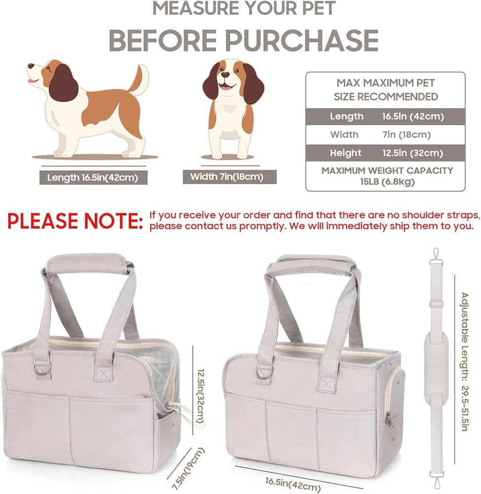 【Perfect Dimensions】: These dog carriers for small dogs measure 16.5" x 7.5" x 12.5", making them taller and wider than other cages available. The recommended maximum load is 18 lbs (8.16 kg). It is important not to choose a dog carrier based solely on weight. Please measure your pet's dimensions before making a purchase.(𝐏𝐥𝐞𝐚𝐬𝐞 𝐧𝐨𝐭𝐞: If you receive your order and find that there are no shoulder straps, please contact us promptly. We will immediately ship them to you.)