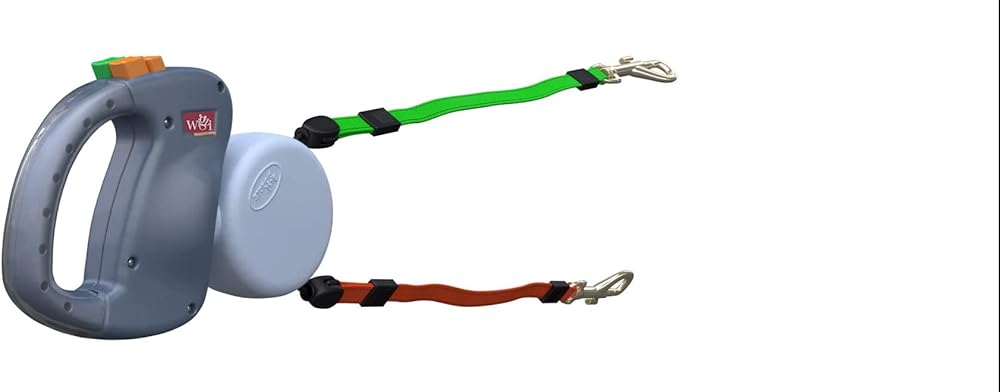 The dual Doggie Retractable non-tangling dog leash features orange and green leads and brake buttons that are color-coded, so you'll always know exactly which dog you're controlling.