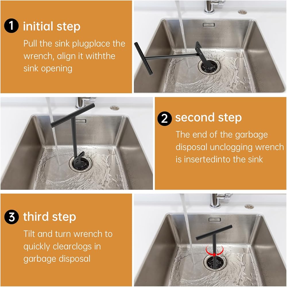Easy to Use : Garbage disposer unjamming wrench inserts into the disposal impellers to effortlessly loosen any jamming.Insert the hex wrench into the center hole at the bottom of the processor and turn it back and forth to release the blockage in food waste disposal.