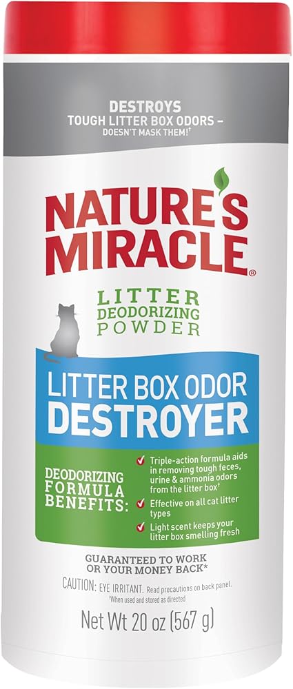Cat owners everywhere are all too familiar with the dreaded smell of a litter box. Luckily, Nature's Miracle Litter Box Deodorizer aids litter in removing tough urine and feces odors your cat leaves behind. The cat odor control formula is designed to be used with all litter types, as well as with both automatic and manual litter boxes. The litter deodorizing powder has a fresh scent to keep your litter box smelling fresh and crisp, making it ideal for multi-cat homes. To use, simply apply, fill and reapply! See label for complete of directions. Our bottles are also made with 25% Post-Consumer Recycled Material. Why choose Nature's Miracle products? Nature's Miracle pet stain and odor removers have been a trusted brand for pet mess cleanup for more than 40 years. When cute pets make not-so-cute messes, you can rely on Nature's Miracle products to get the job done.