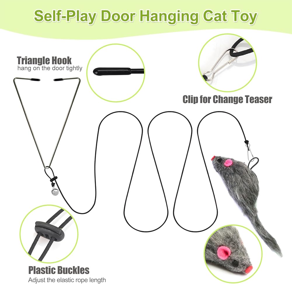 Popular Cat Toys for Bored Indoor Adult Cats The 2 cat toy wand is a great interactive cat toy for you teasing your cats and bonding relationship with them. The 2 hanging cat toy that 1pc can be fixed on the door frame, doorknob and 1pc can be hanging on a door frame or handle, combines string and plush to create an irresistible lure, cat will play it by self, it's a great home alone cat toy. Practical cat toy set, 2pcs hanging cat toy+2pcs cat wand toy + 3pcs cat toy worm + 2pcs feather cat teaser toy + 1pc replacement elastic rope. Cat wand toys is telescopic rod design, adjustable from 15 Inches to 38 Inches. 1pc door hanging cat toy mouse with triangle hook, and 1pc plush fish toy with sticker.