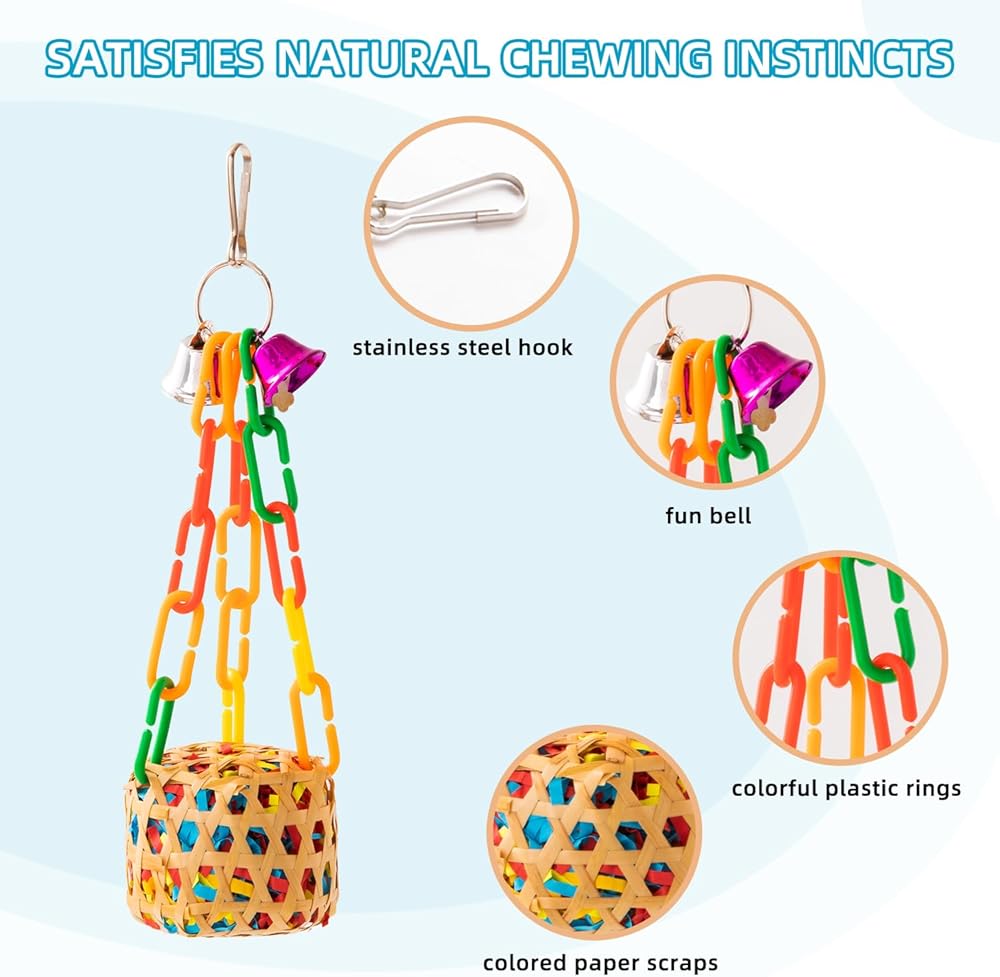 NATURE AND SAFE MATERIAL:The parakeet toys are made of nature rattan balls, bamboo, wooden blocks, colored shredded paper, These combine to become durable and practical. Satisfy the birds' daily chewing habits, but also let them not boring, all day long have something to do.
