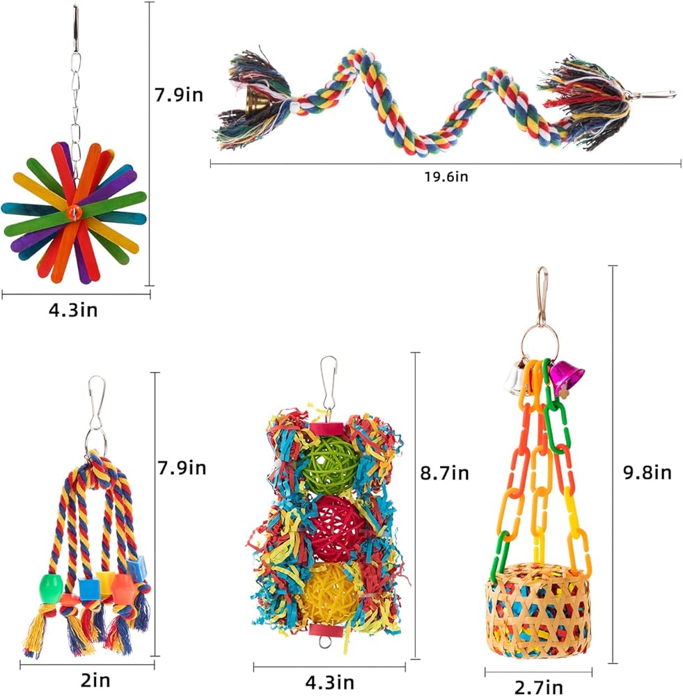 COLORFUL AND INTERESTING DESIGN:The bird toys set includes 5 brightly colored chewing toys, that are hand-woven basket, bird rope perch, three rattan balls with confetti, hanging colored sticks, and cotton string with beads. These fun bird chewing toys will attract your pet bird's interest and keep them active.
