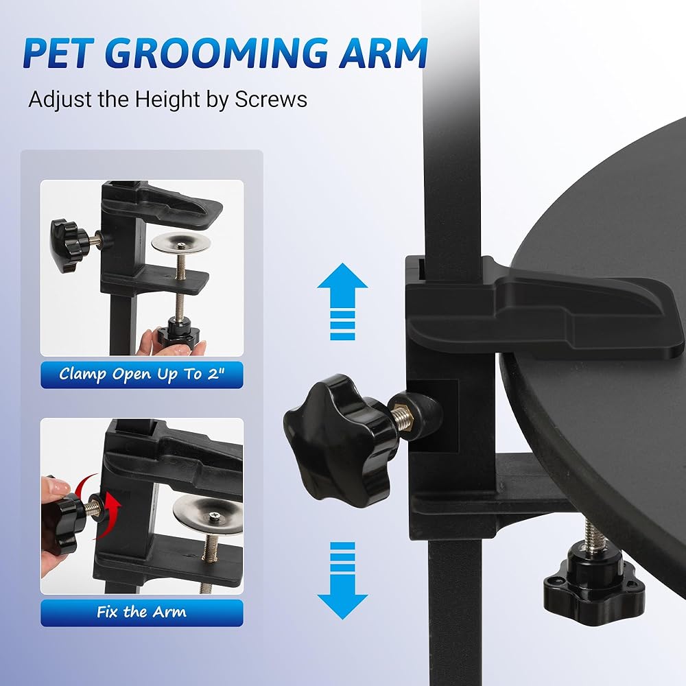 𝐂𝐮𝐬𝐭𝐨𝐦𝐢𝐳𝐚𝐛𝐥𝐞 𝐇𝐞𝐢𝐠𝐡𝐭 𝐀𝐝𝐣𝐮𝐬𝐭𝐦𝐞𝐧𝐭: Height of dog grooming arm can be adjusted from 18" to 35", and fits tables up to 2" thick. 2-knob of pet grooming stand design lets you easily adapt the height to different dog sizes - Small and Medium.