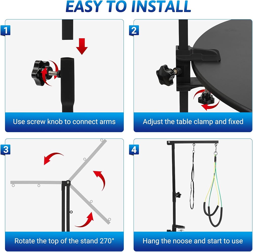 𝐄𝐚𝐬𝐲 𝐈𝐧𝐬𝐭𝐚𝐥𝐥𝐚𝐭𝐢𝐨𝐧 & 𝐅𝐨𝐥𝐝𝐢𝐧𝐠 𝐃𝐞𝐬𝐢𝐠𝐧: With easy-to-follow instructions, you can install and clamp the grooming arm onto pet grooming table in just 5-8 minutes. When you're done, simply fold it up and store it away to save space.