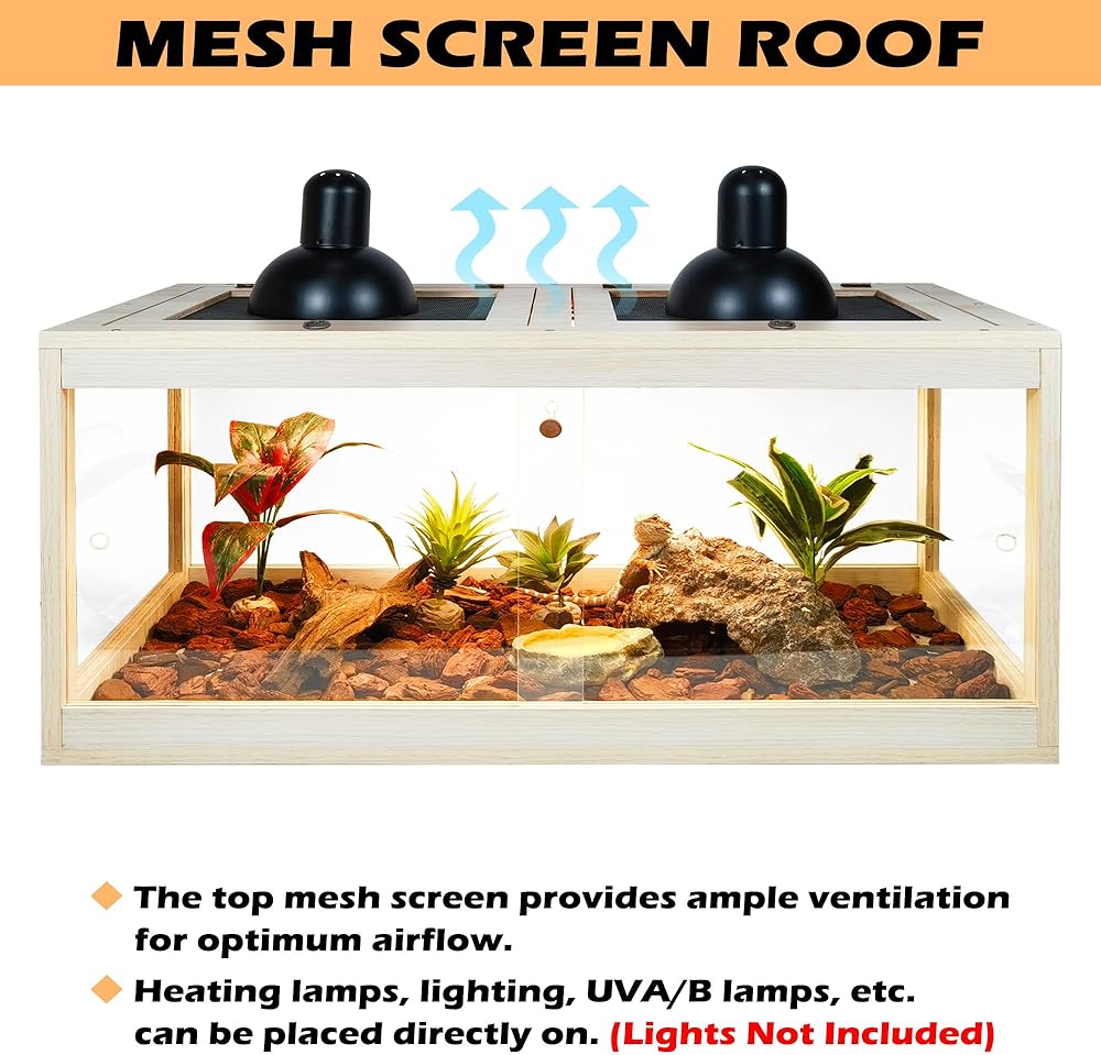 【Practical Design】Our reptile terrarium features a functional design with double sliding front doors, effortlessly opened or secured with a lock to prevent escape attempts. The top is outfitted with strong metal mesh, facilitating proper ventilation and enabling the direct placement of heat lamps and UVA/B lights (not included) for optimal temperature regulation.