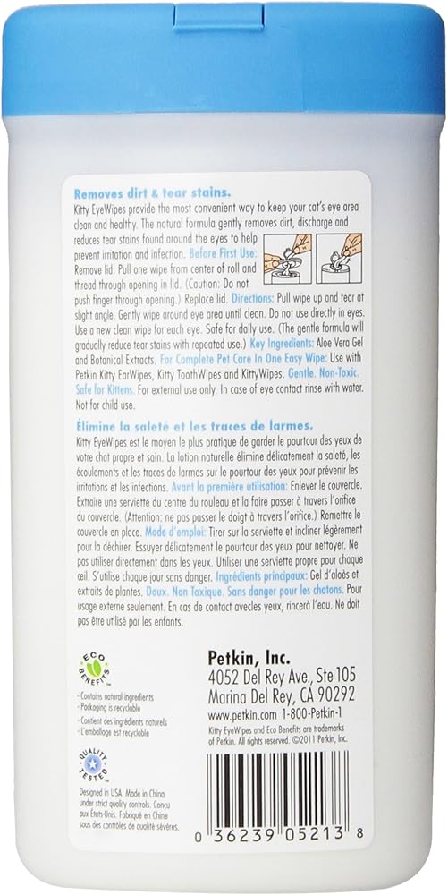 Keep you cat's eye area clean the easy way with Kitty EyeWipes. These extra soft cloths are moistened with a gentle cleanser that removes dirt and discharge around the eye area. Use daily to help reduce tear stains and prevent eye infections.