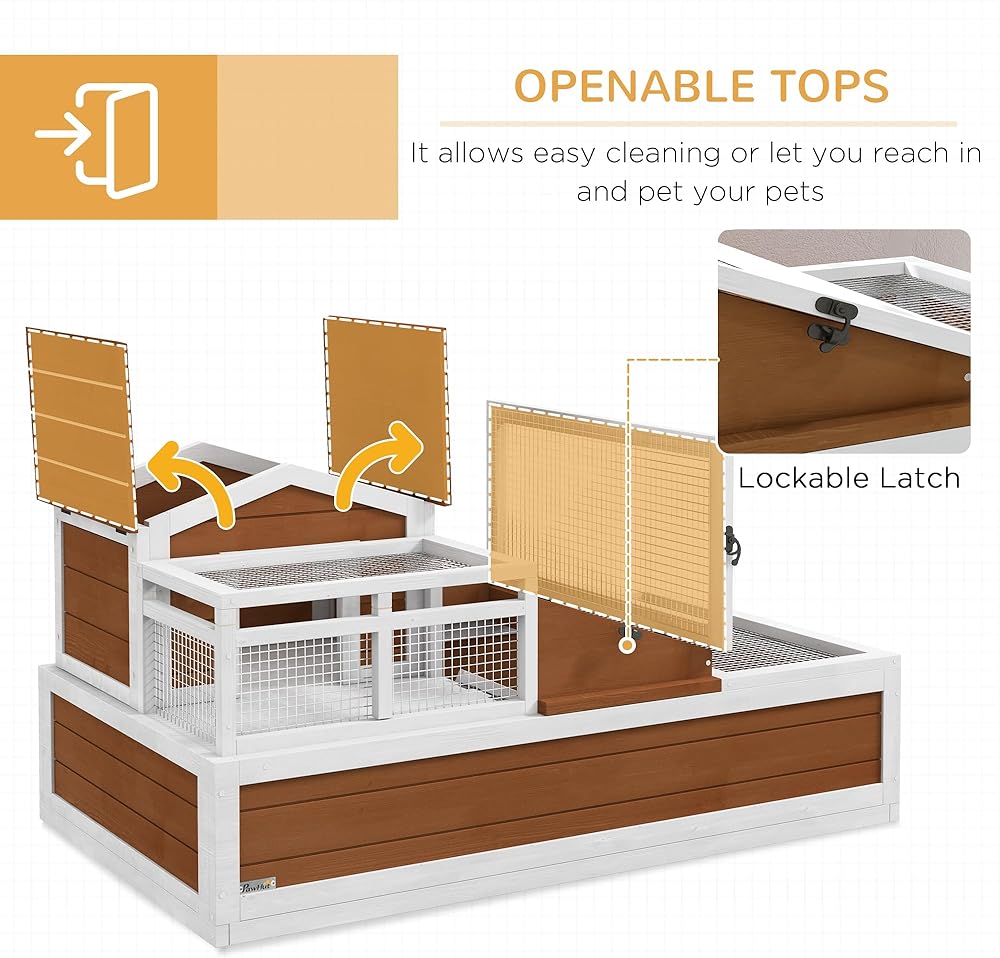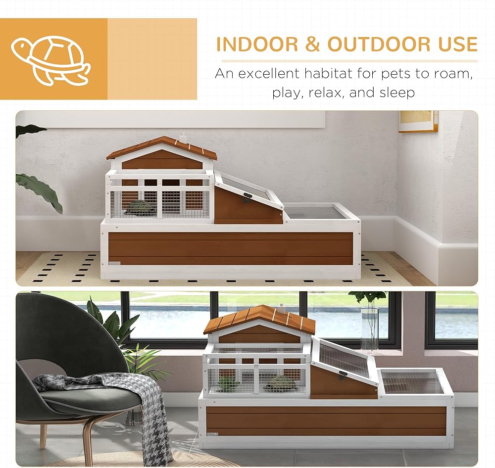 Indoor/Outdoor: Each top of the tortoise habitat is openable, letting you reach in to access your reptile friend. Close the tops to let your tortoise hide, or open them to let in light. The wooden walls are coated in water-resistant outdoor paint, so your shelled buddy can get some sun out on the patio.