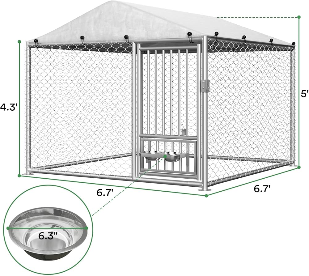 Rovibek Outdoor Dog Kennel with Roof, 6.7 X 6.7 Outside Dog Kennel Heavy Duty Dog Run Fence with Waterproof Sun-Proof Cover, Outside Dog Playpen with 2 Stainless Steel Dog Bowls