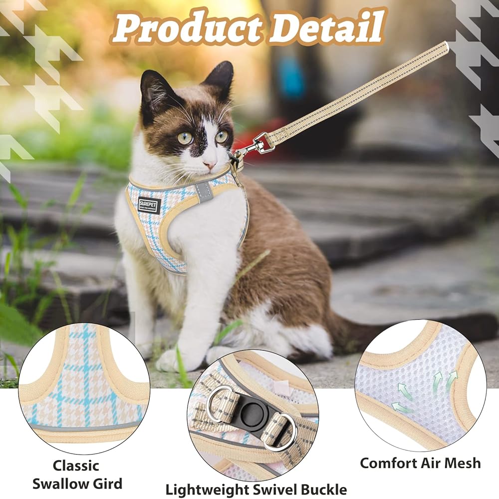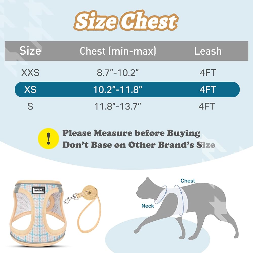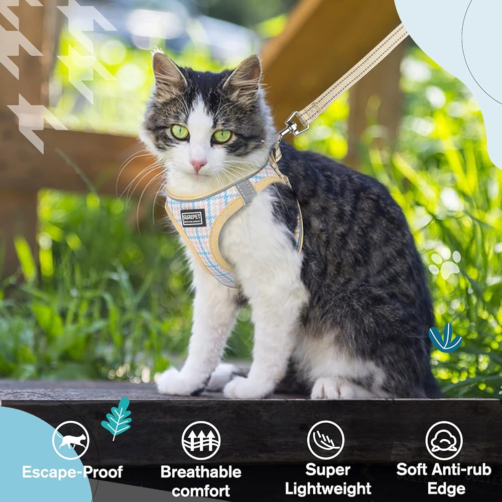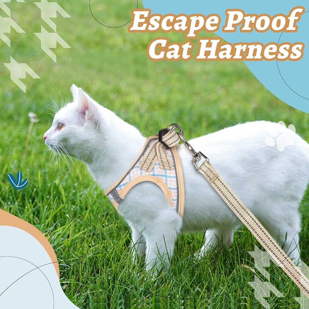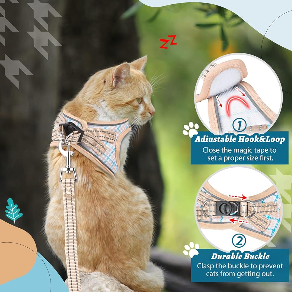 🐱[ Pattern Cat Harness ]- Design with large houndstooth pattern is classic and retro, yet modern and chic. Trust this pet harness leash set could help your cat catch the eyes of all friend's instantly. 3 size & 3 color available, please carefully measure your cat's chest and choose size refer to the size chart.