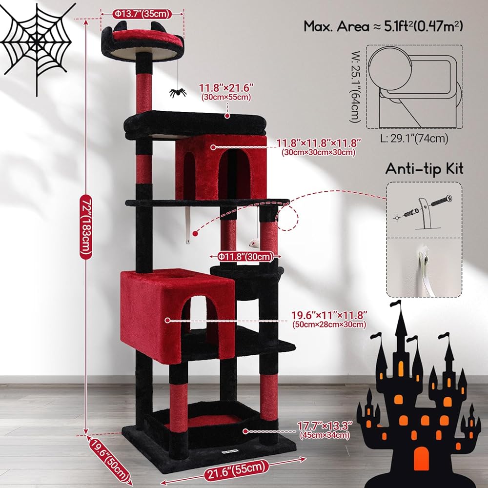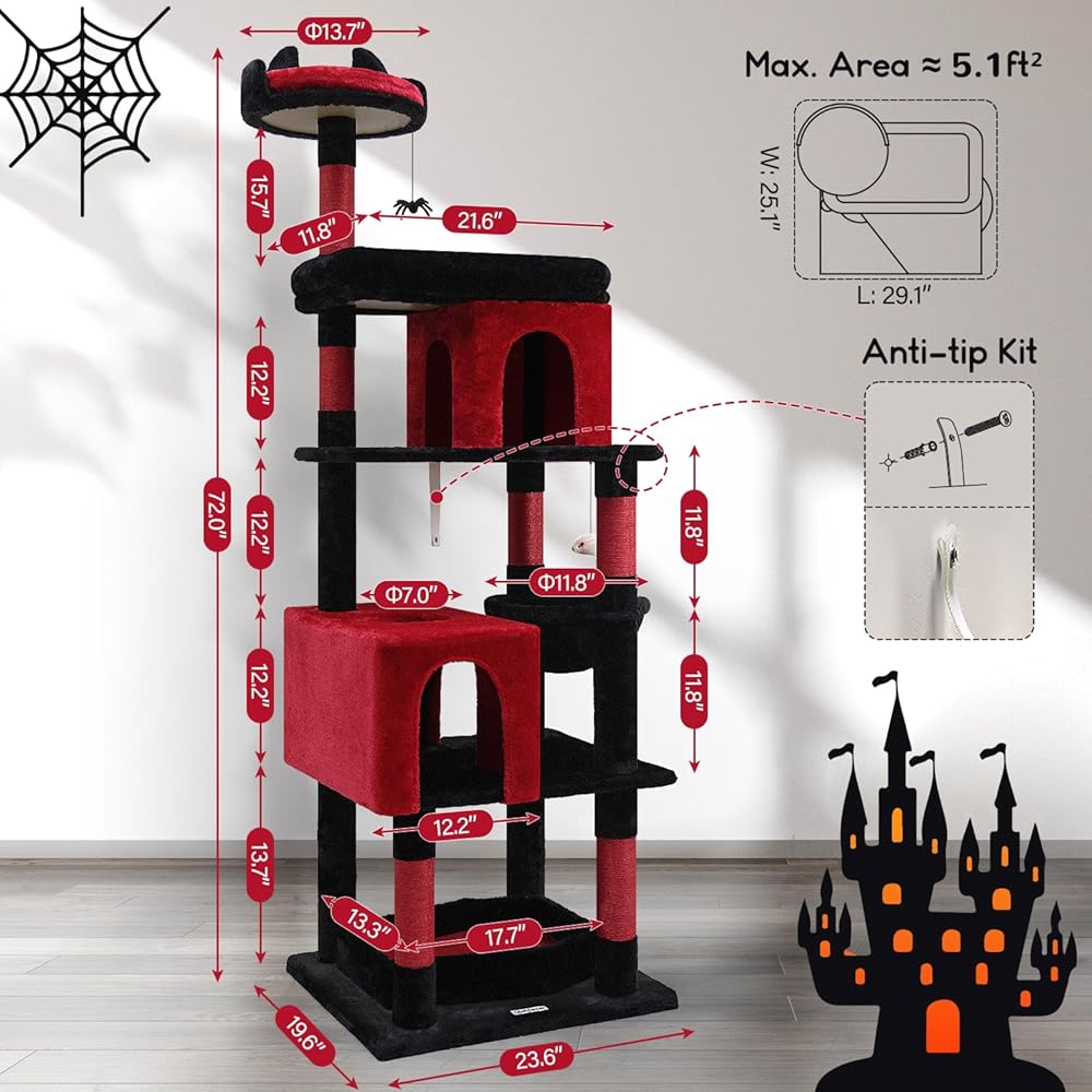 Globlazer Heavy Duty Gothic Cat Tree, 72in Large Cat Tower with Coffin Bed, Sturdy Maine Coon Cat Tree for Large Cats 20 lbs+, Medieval Castle Style with 6 Scratching Posts & Hammock, S72, Black & Red