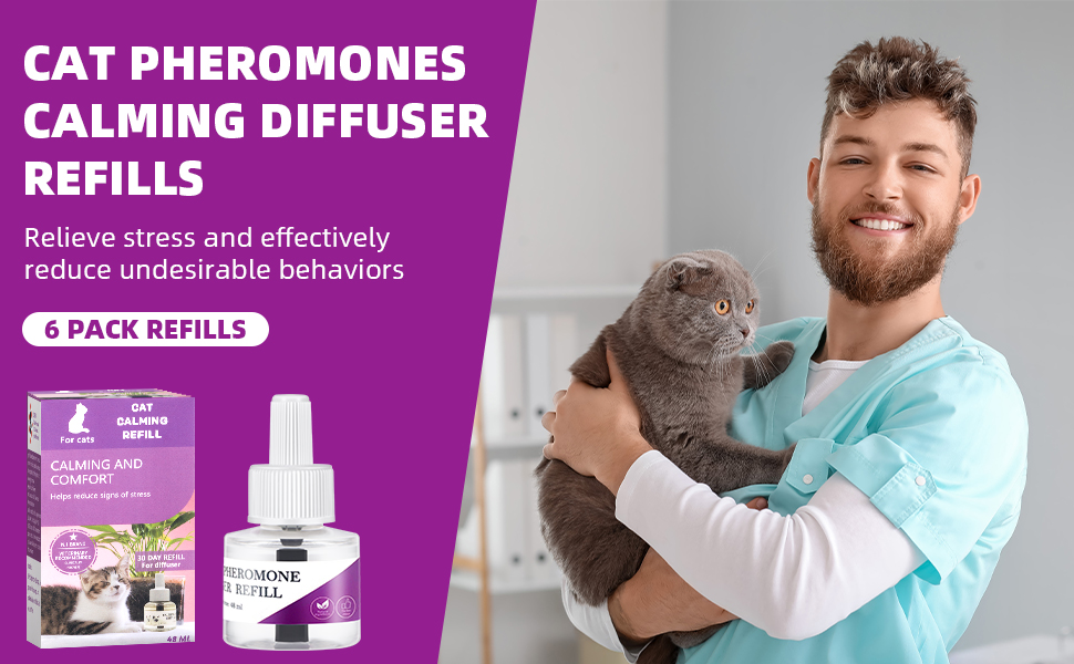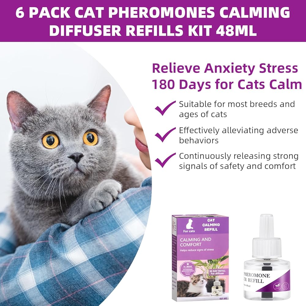 Value Cat Calming Diffuser Refill - Our Cat Pheromones Calming Diffuser Refill Set releases pheromones to relieve stress and effectively reduce undesirable behaviors such as spraying and scratching. The set includes 6*48 ml refills, providing up to 180 days of calming effects, providing your cat a soothing, stress-free environment