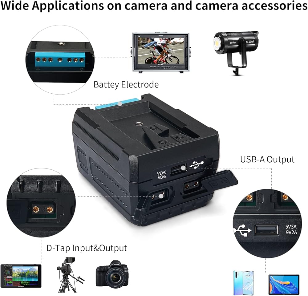 【Wide Application】It fits all cameras and LED lights with standard v-mount battery plates. With the help of related cable can power on the cameras,camrecorders,led lights, flash lights etc.