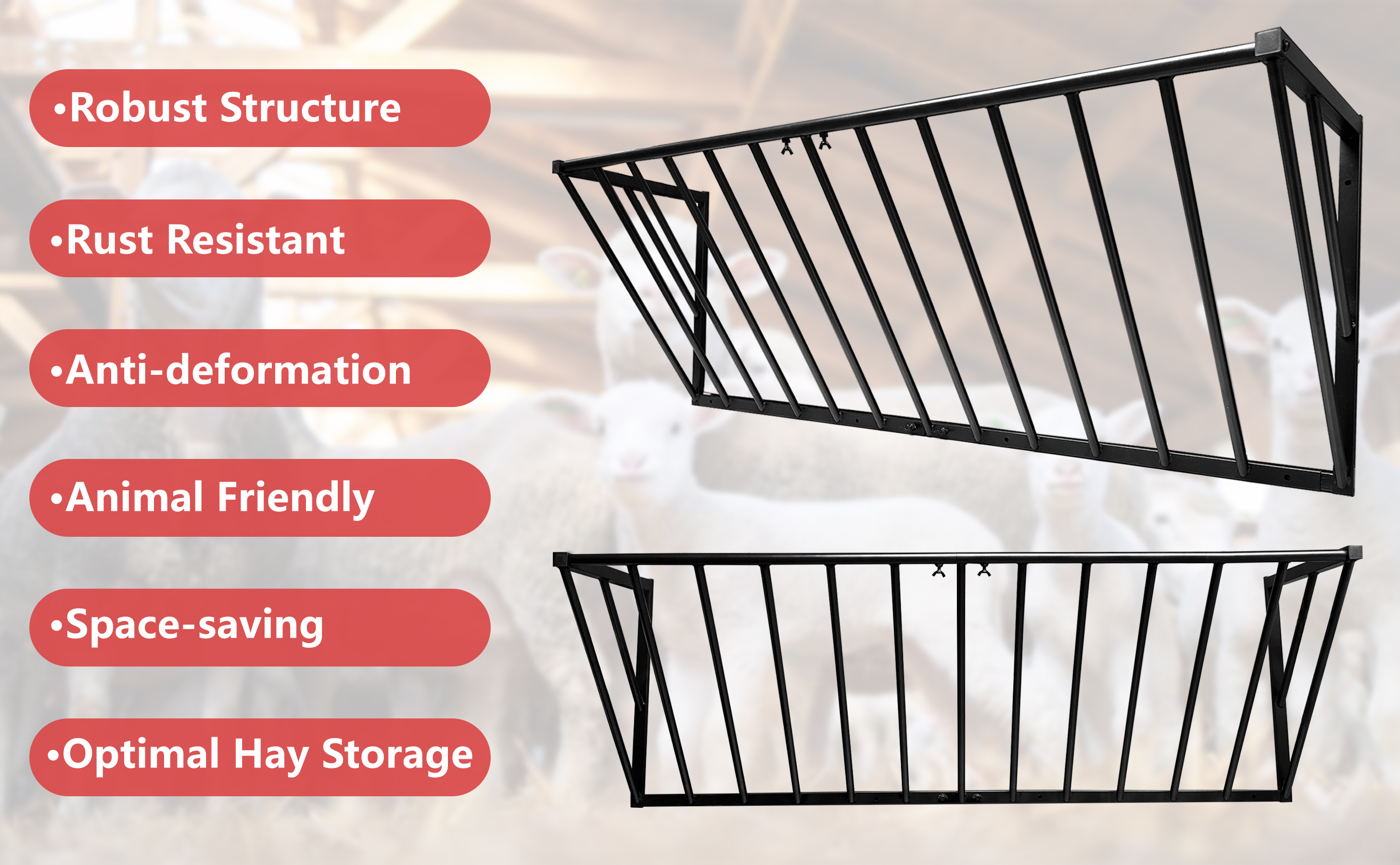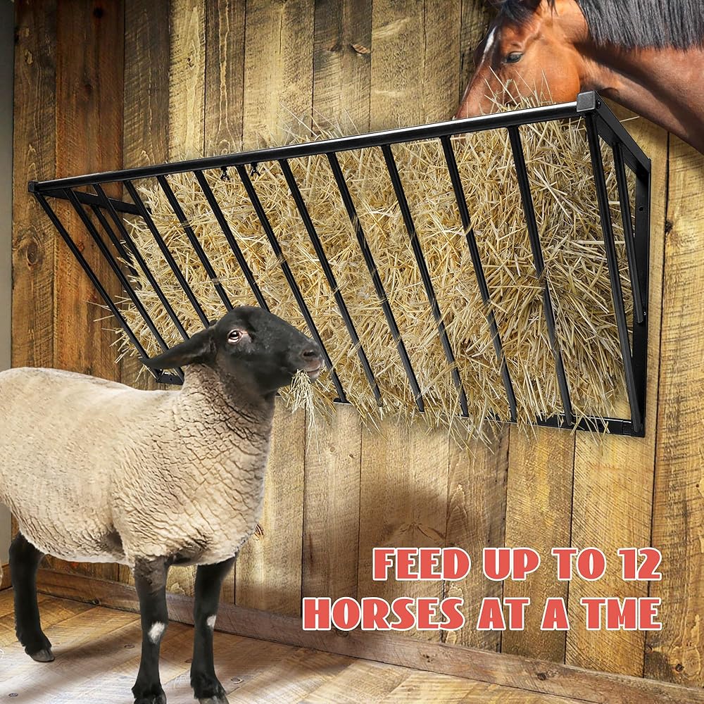 【Effortless Feeding】Upgrade your barn with our premium wall-mounted hay feeder rack, designed for ultimate convenience and efficiency. This feeder allows easy access to hay, ensuring your animals feed comfortably while reducing waste. Ideal for horses, sheep, and other hay-eating livestock, it keeps hay off the ground, maintaining cleanliness and hygiene.