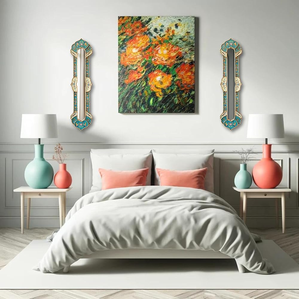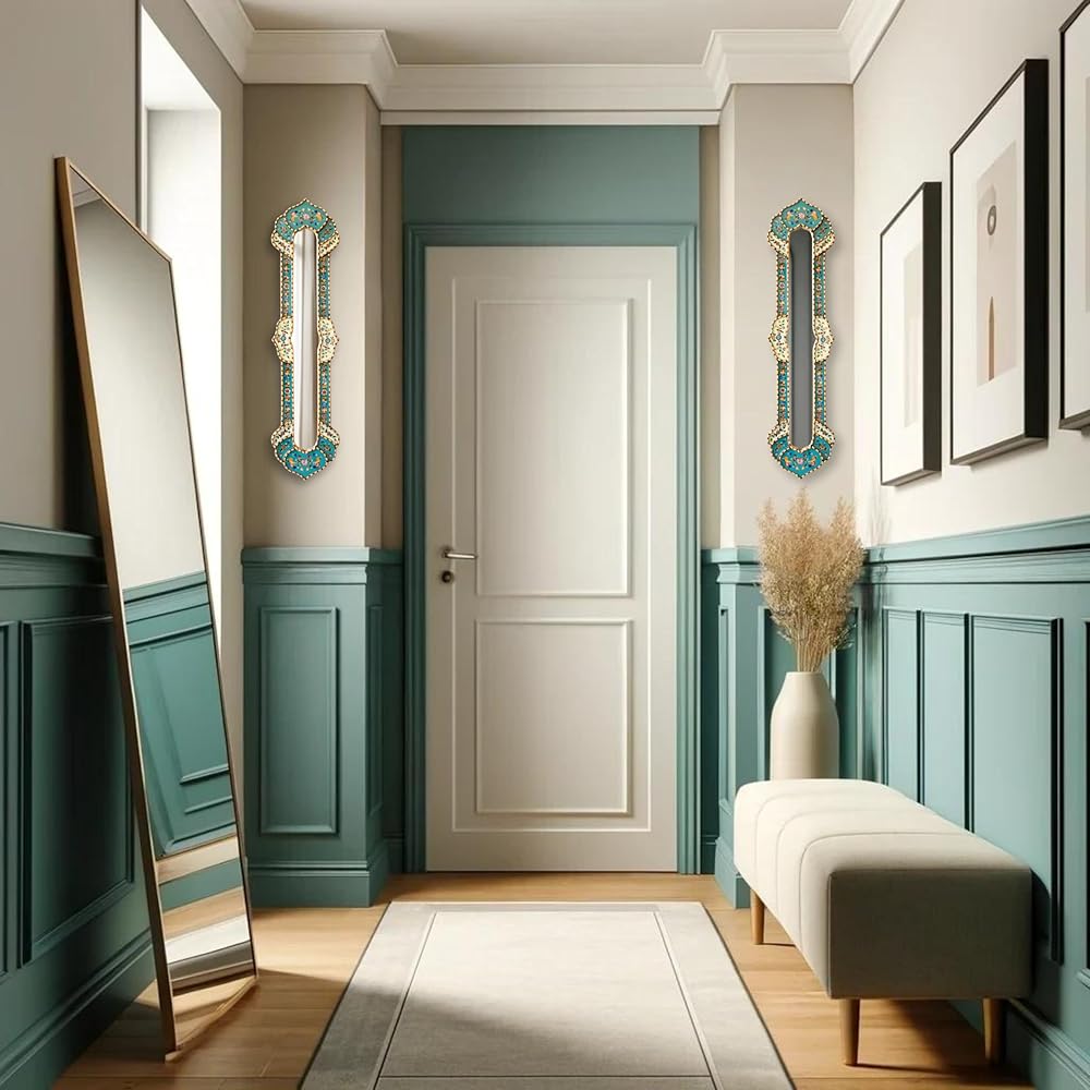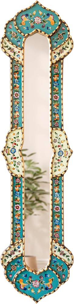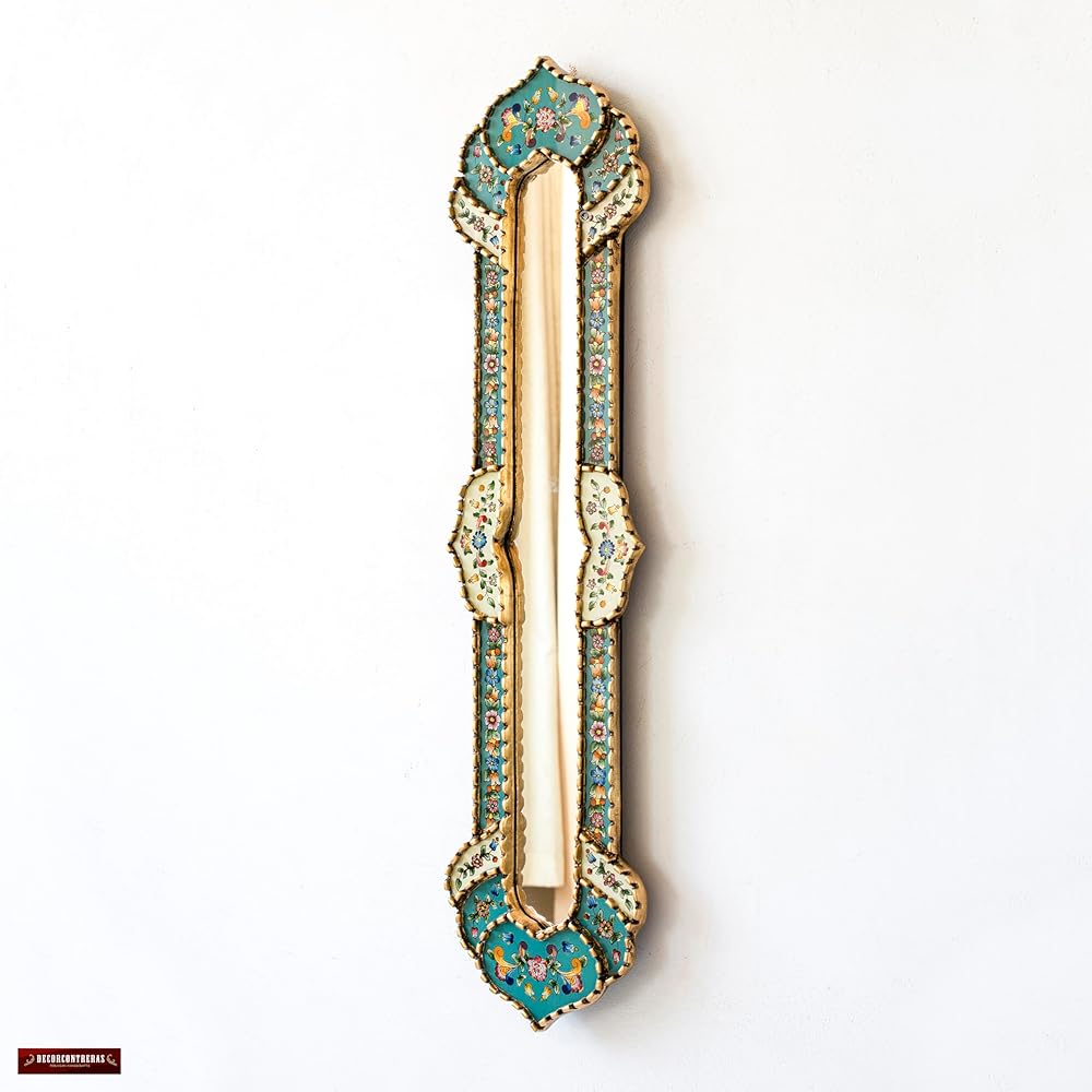Narrow Mirror for Wall Art Decor 35.8" Tall - Decorative Long Skynni Mirrors, Peruvian Painting on Glass Skinny Mirror with Bronze Leaf Wood Framed (Turquoise)