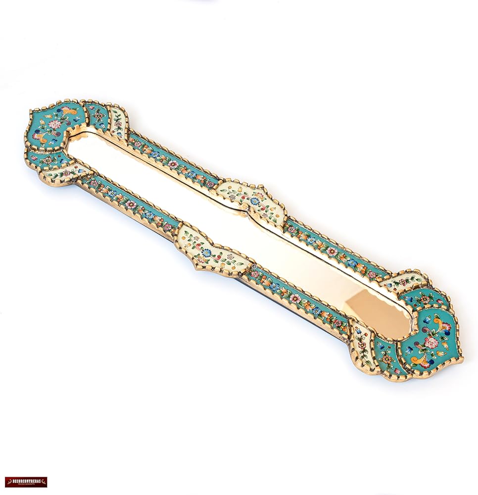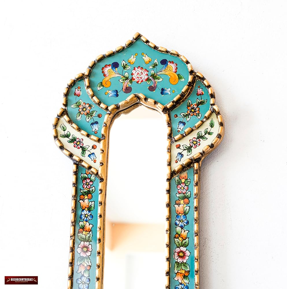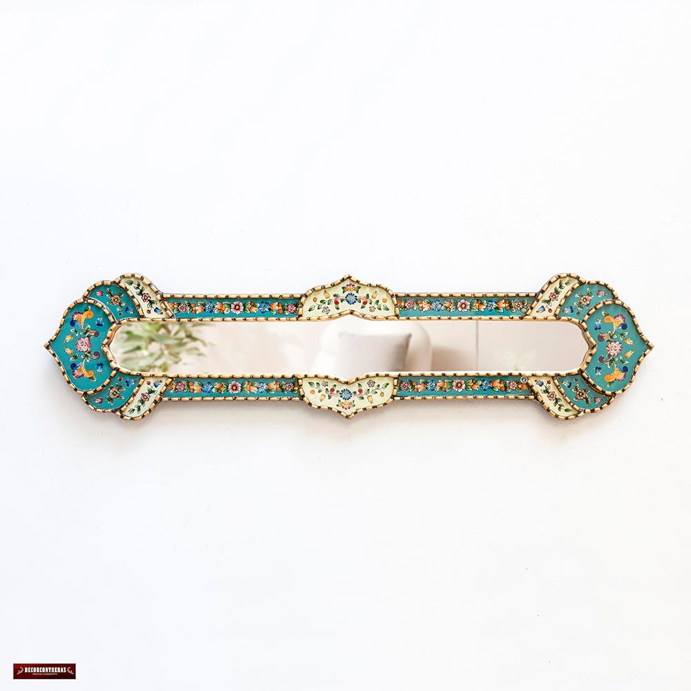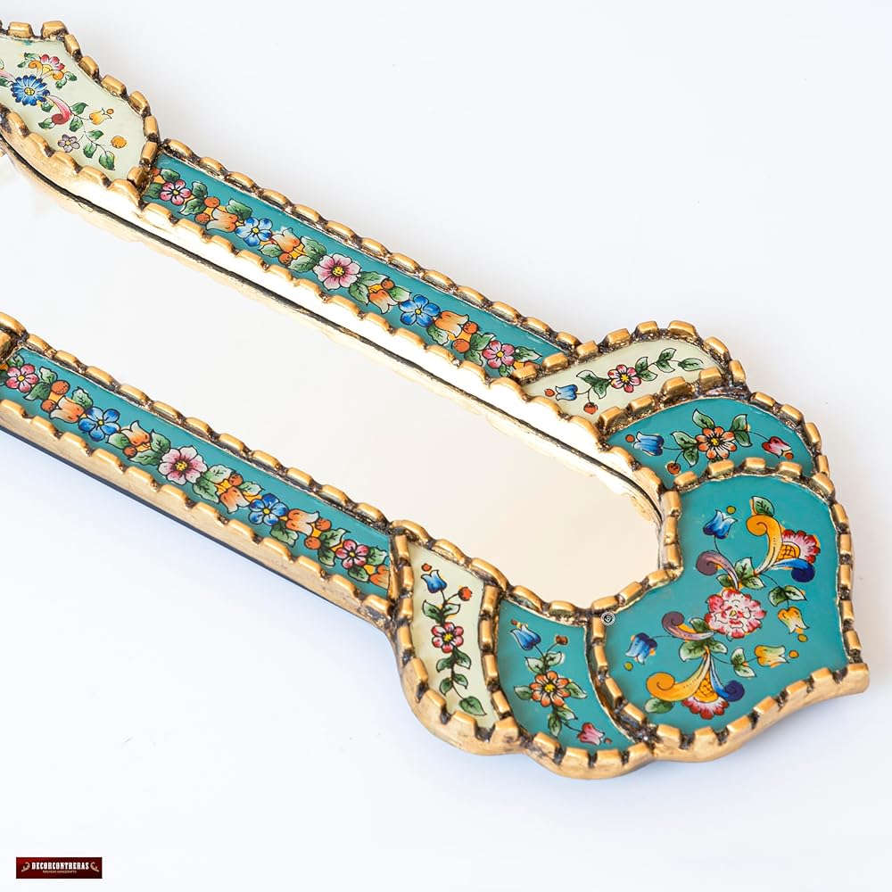 HANDMADE IN PERU: This accent long Mirror ”cuscaja Style” is created entirely by hand using the peruvian reverse painted glass technique. Hand-painted glass are placed in the wooden frame then covered in gold leaf