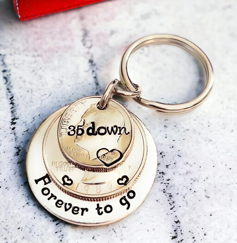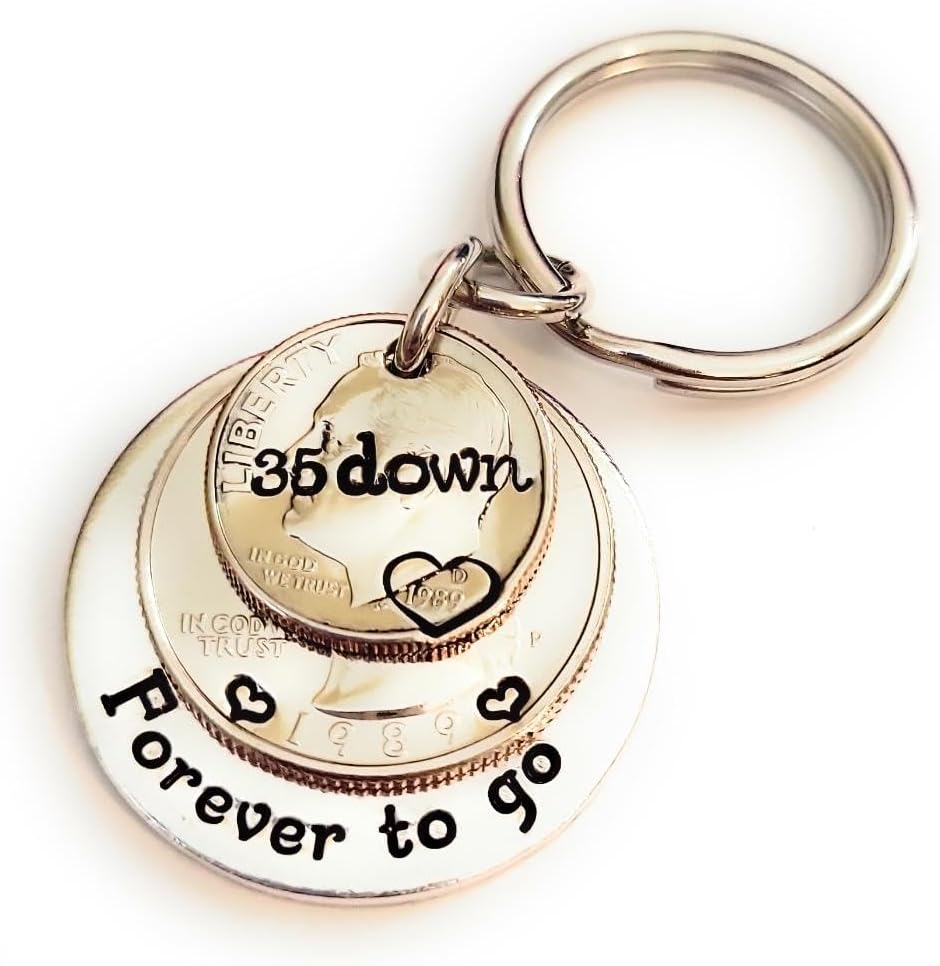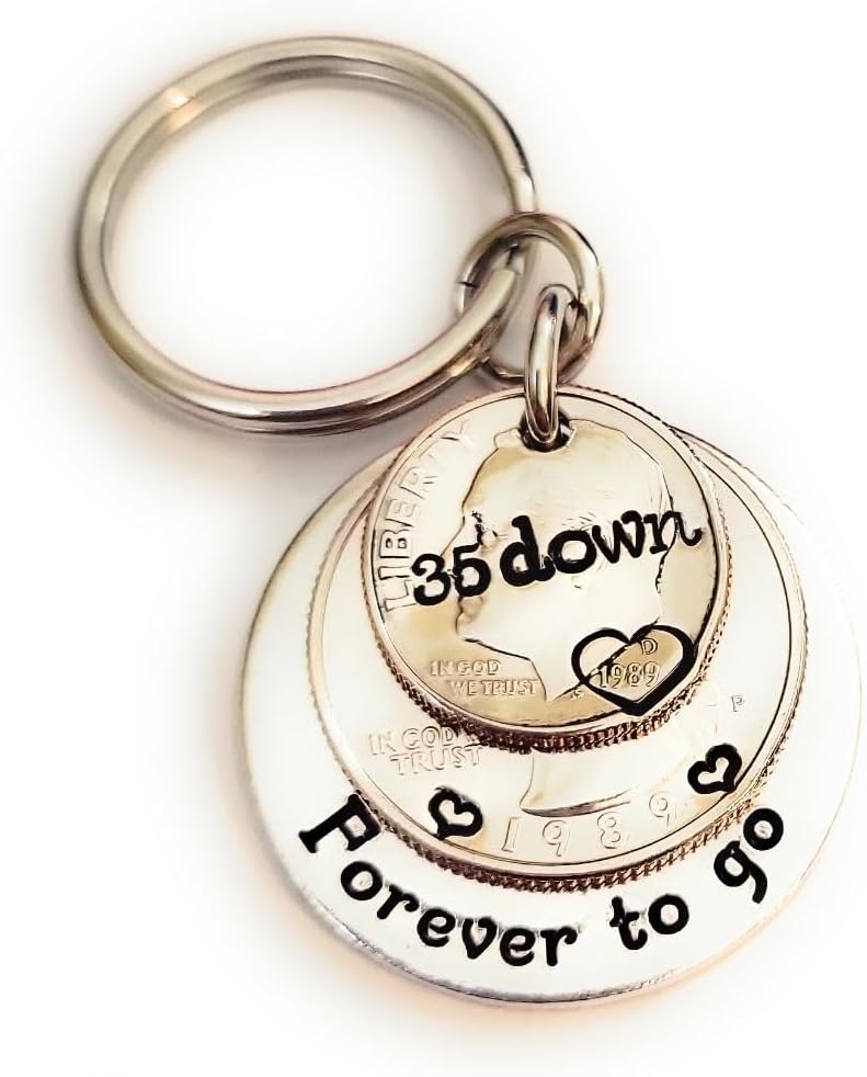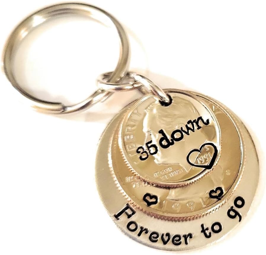 35 Years!! What a milestone! This is the perfect unique gift for the person that has everything. I have hand stamped "35 down" on the top 1989 dime and "Forever to go" on the back aluminum layer. There are also hearts on each side of the year on the quarter and a heart around the date on the dime.Aluminum is a great alternative to the stainless steel pieces I offer. It will not tarnish or change colors and has a lighter weight than stainless steel.